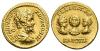 IMPERIO ROMANO. SEPTIMIO SEVERO. Áureo. Roma (202). A/ Busto laureado, drapeado y acorazado a der.; SEVER P AVG P M TR P X COS III. R/ Busto frontal de Julia Domna flanqueada por Caracalla y Geta; FELICITAS/ SAECVLI. AU 7,28 g. 20,3 mm. RIC-181C; Cal-2593. Manipulación en el campo del anv. EBC-/MBC+. Rara.