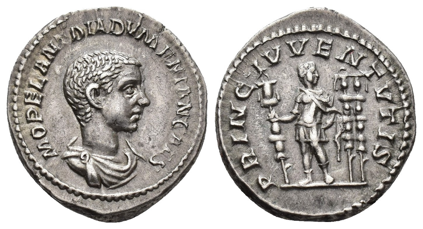 IMPERIO ROMANO. DIADUMENIANO. Denario. Roma (217-218). A/ Busto drapeado a der.; M OPEL ANT DIADUMENIAN CAES. R/ Diadumeniano en traje militar a izq. entre dos estandartes; PRINC IVVENTVTIS. AR 3,68 g. 20,5 mm. RIC-102a. EBC-/MBC+. Muy escasa.