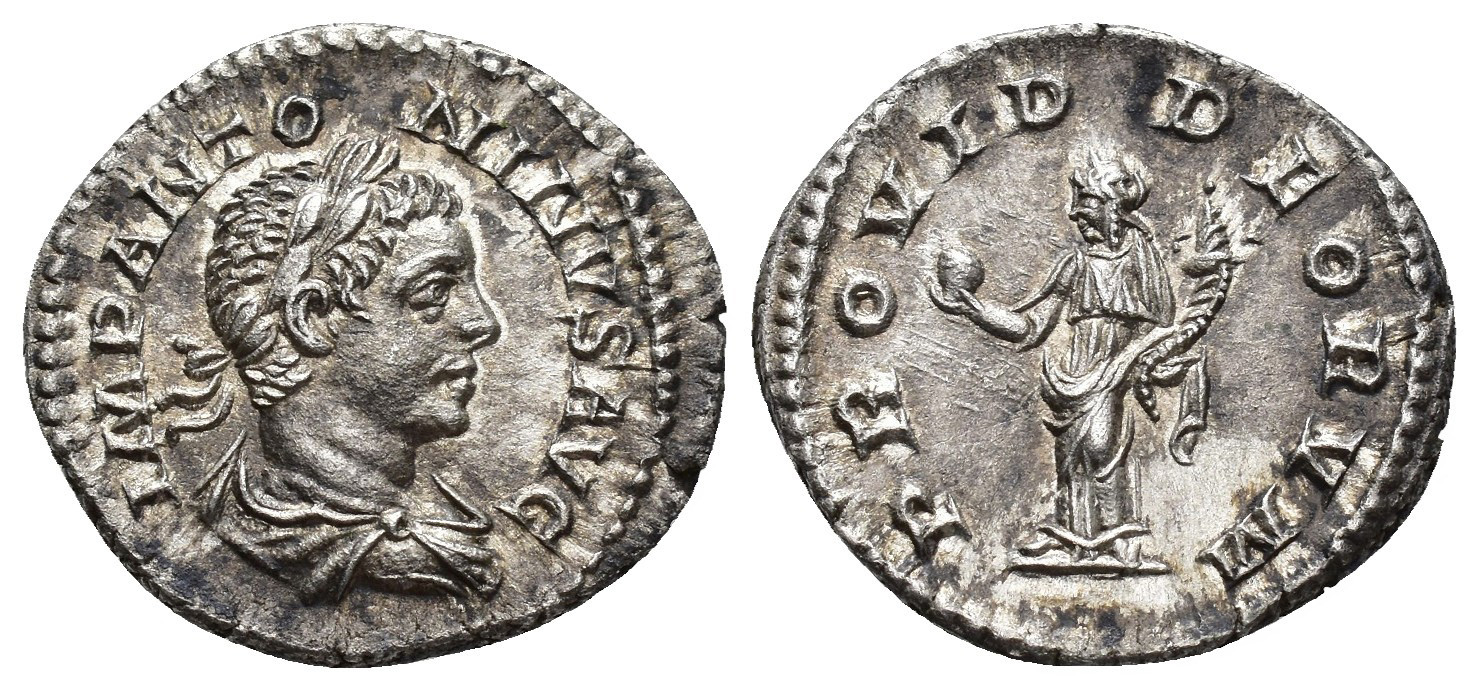 IMPERIO ROMANO. HELIOGÁBALO. Denario. Roma (218-222). A/ Busto laureado y drapeado a der.; IMP ANTONINVS AVG. R/ Providentia a izq. con globo y cornucopia; PROVID DEORVM. AR 3,03 g. 19,8 mm. RIC-128b. EBC.