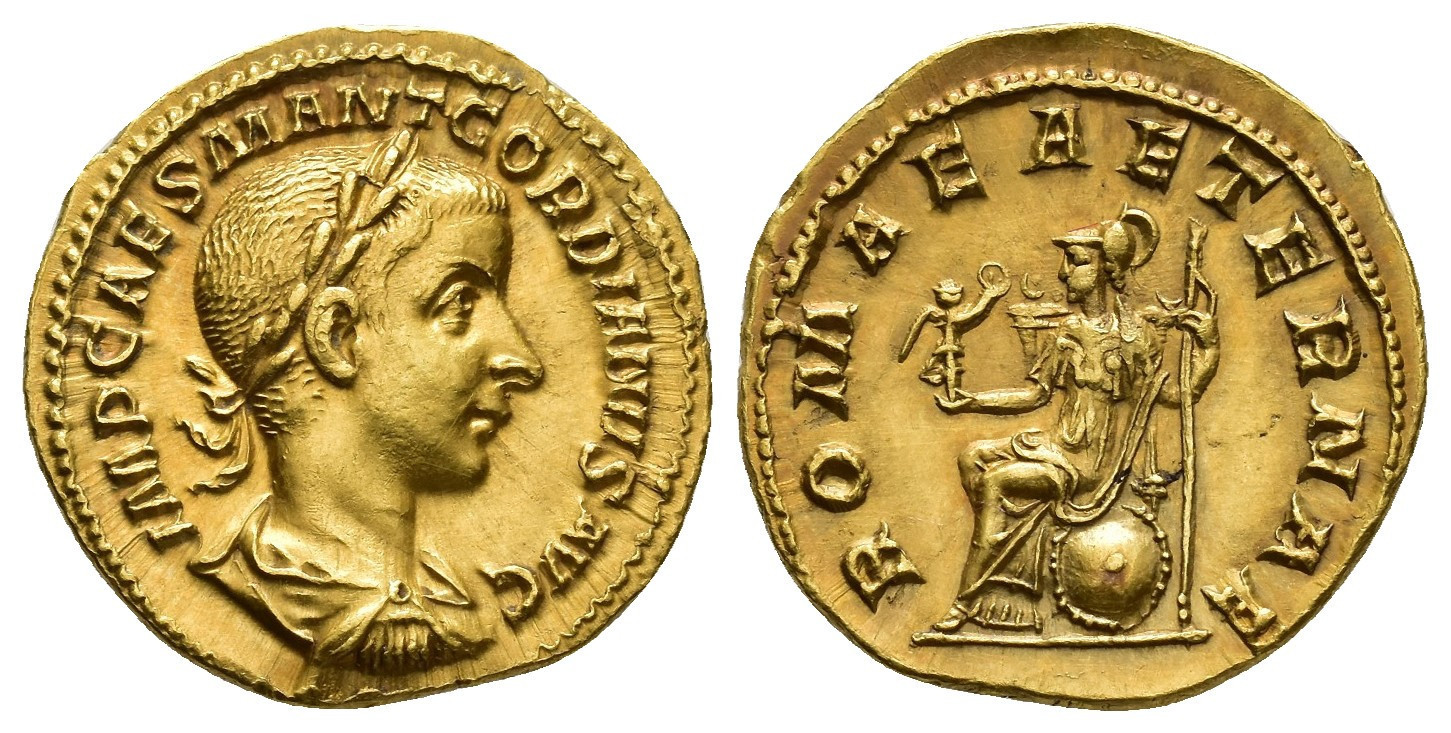 IMPERIO ROMANO. GORDIANO III. Áureo. Roma (c. 240). A/ Busto laureado, drapeado y acorazado a der.; IMP CAES M ANT GORDIANVS AVG. R/ Roma sentada a izq. con lanza y Victoria, escudo bajo el trono; ROMAE AETERNAE. AU 4,79 g. 19,1 mm. RIC-no; Cal-3230a. EBC. Rara.