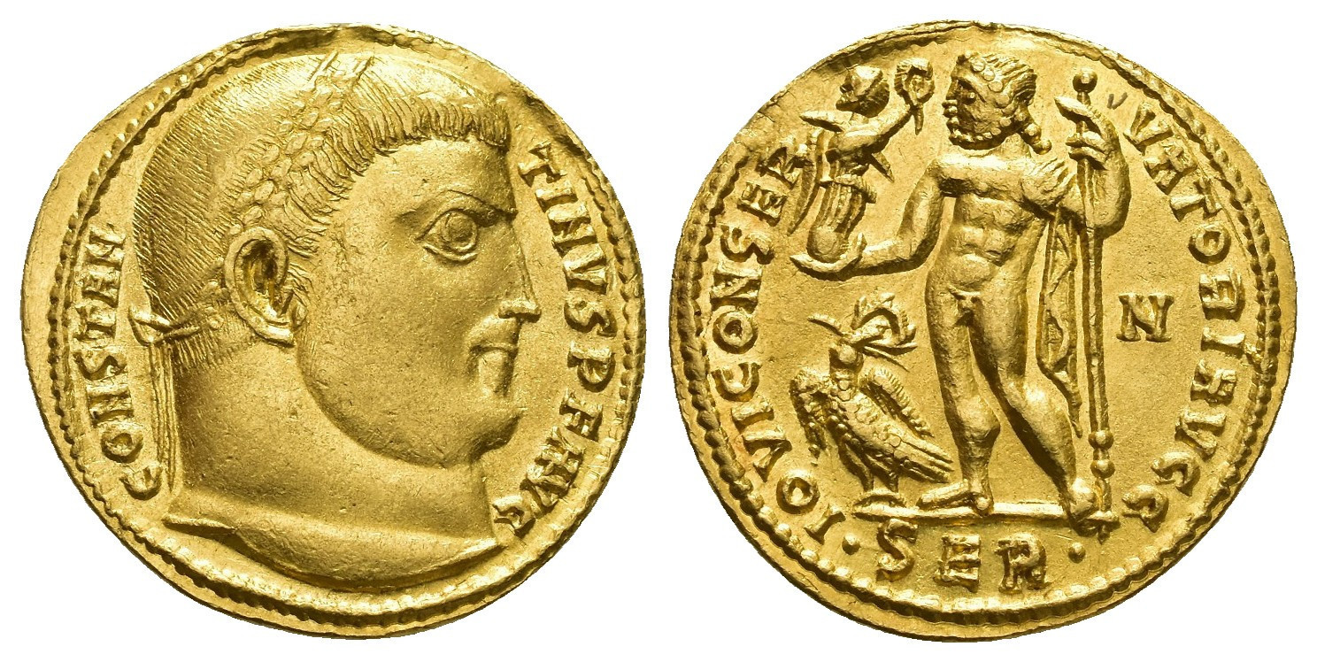IMPERIO ROMANO. CONSTANTINO I. Áureo. Serdica (313-314). A/ Cabeza laureada a der.; CONSTANTINVS P F AVG. R/ Júpiter a izq. con cetro, victoria y águila con corona en el pico a sus pies; IOVI CONSERVATORI AVGG. -/N//.SER. AU 5,28 g. 19,3 mm. RIC-2; Cal-5174. B.O. Pequeñas marcas. EBC/EBC+. Muy escasa.