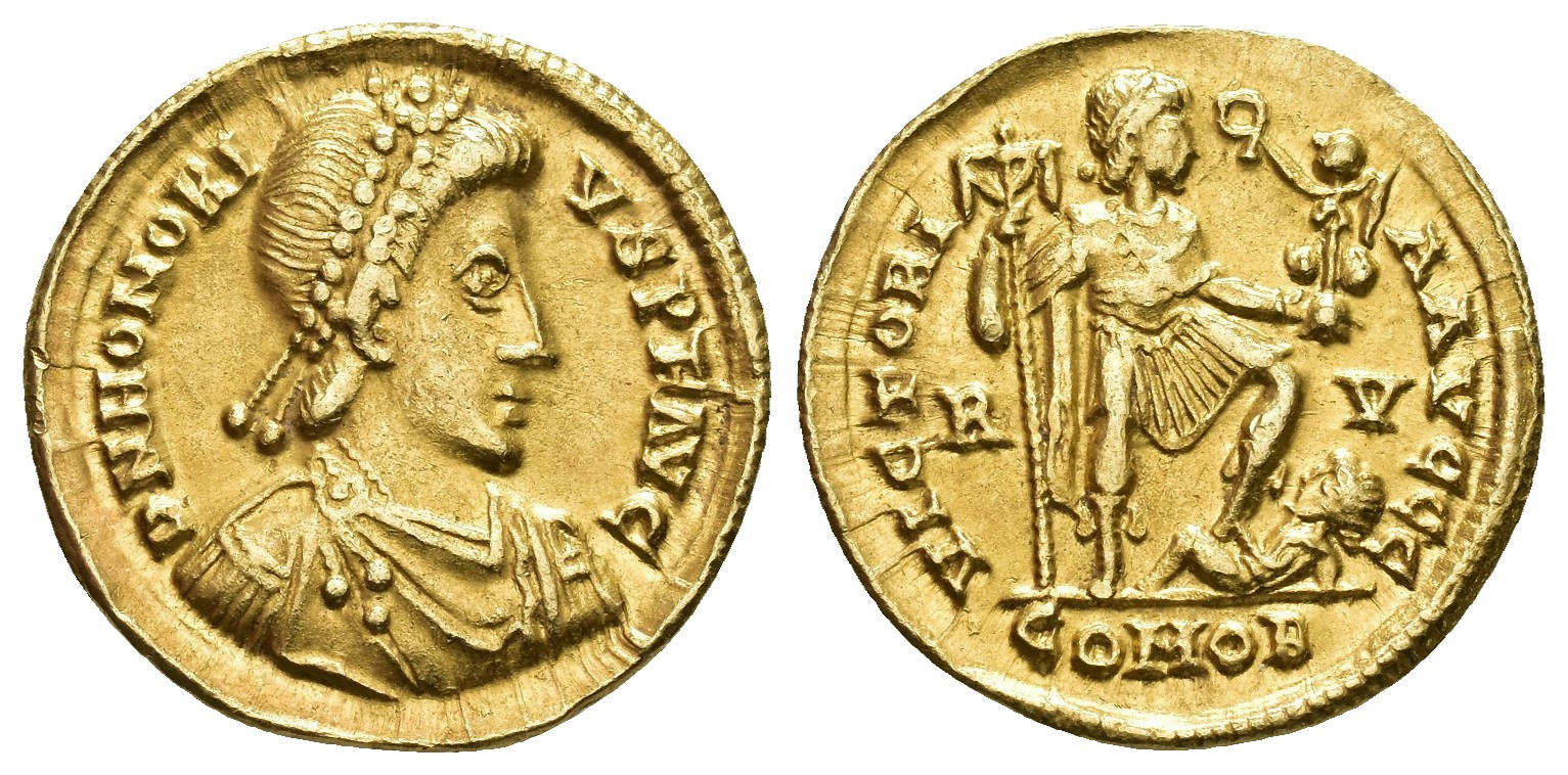 IMPERIO ROMANO. HONORIO. Sólido. Ravenna (408-423). A/ Busto diademado de perlas, drapeado y acorazado a der.; D N HONORIVS P F AVG. R/ Honorio en traje militar a izq. con victoria y lábaro, cautivo a sus pies; VICTORIA AVGGG. R/V//COMOB. AU 4,42 g. 19,8 mm. RIC-1328. R.B.O. MBC+.