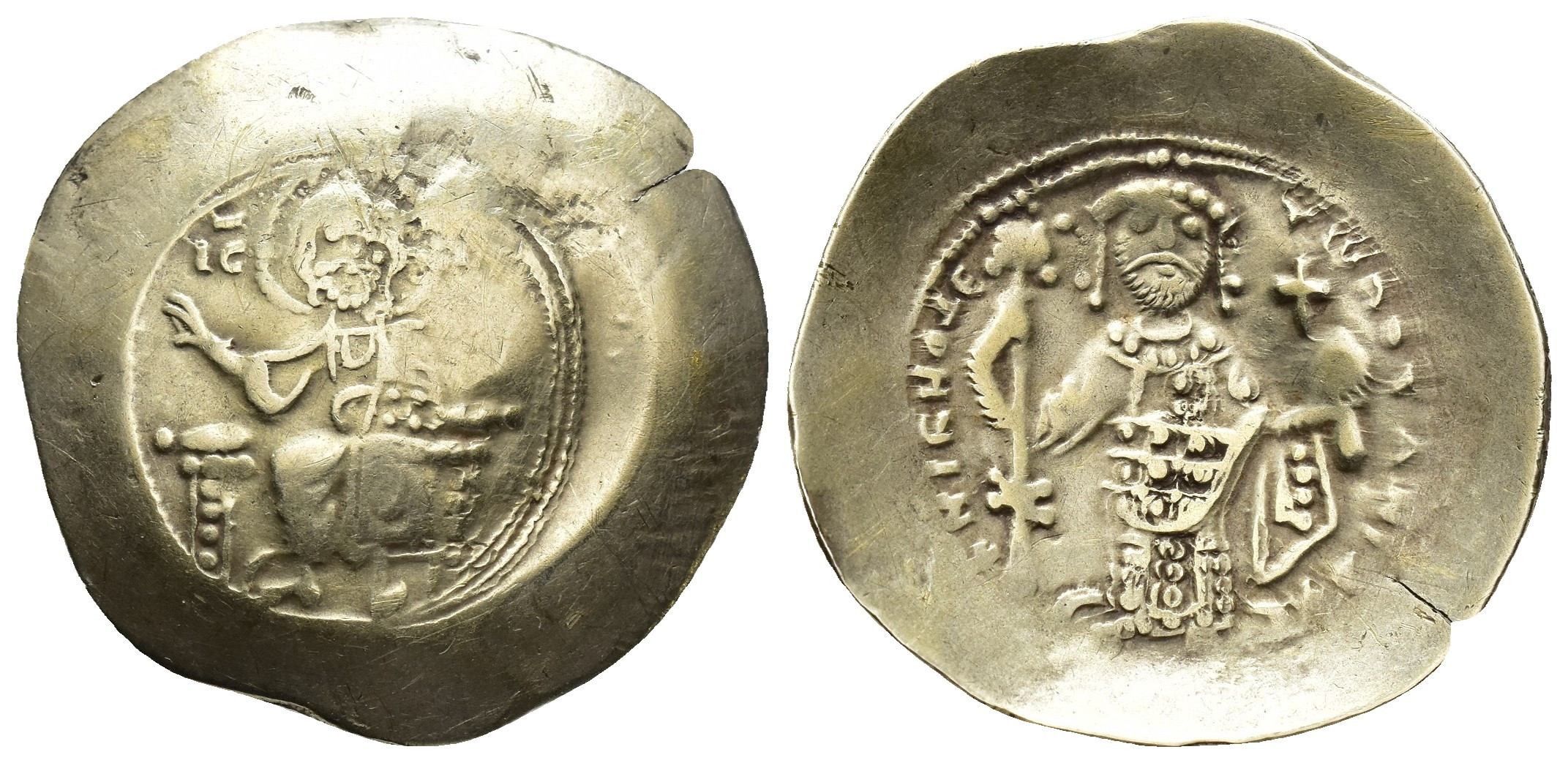 IMPERIO BIZANTINO. NICÉFORO III. Histamenon. Constantinopolis. A/ Cristo frontal entronizado en trono sin respaldo. R/ El emperador de frente con lábaro y globo crucífero. EL 4,01 g. 28,7 mm. SBB-1881. Fina grieta y marcas. MBC-/MBC.