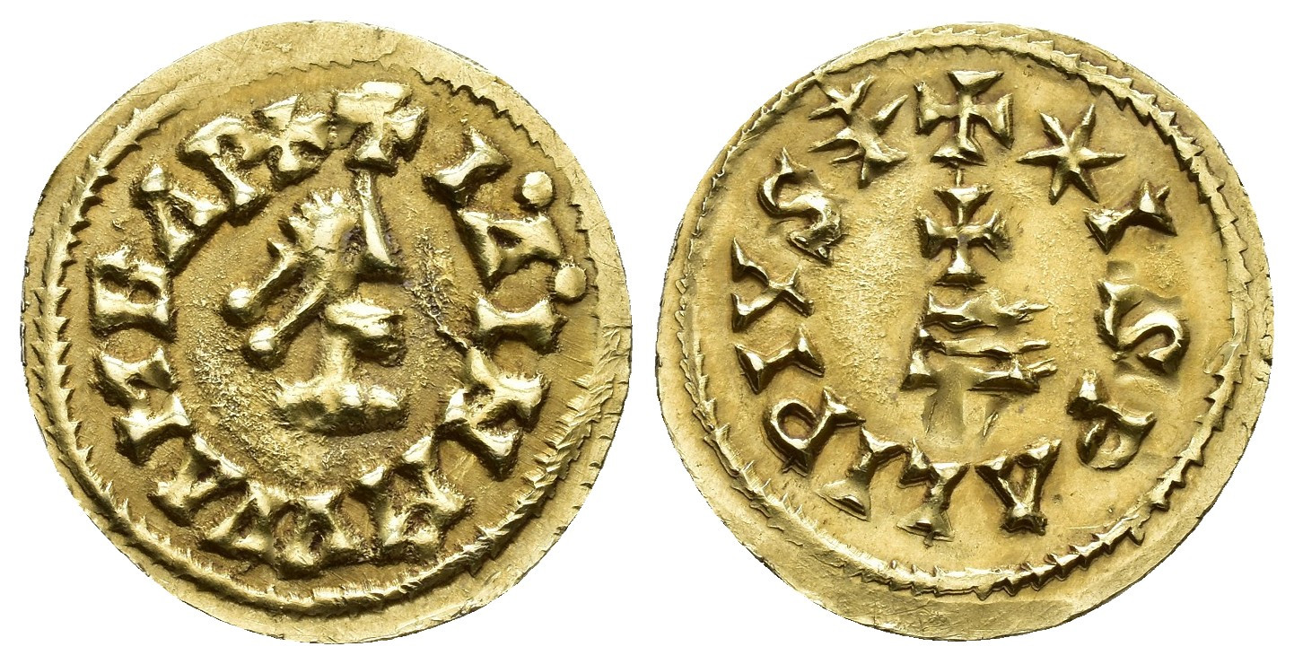 REYES VISIGODOS. WAMBA. Tremissis. Ispali. AU 1,47 g. 19,2 mm. CNV-474.1. Pequeño defecto de acuñación en rev. MBC+. Muy escasa.