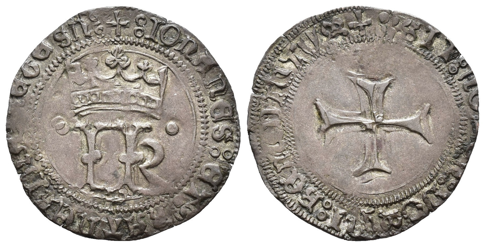 REINO DE NAVARRA. JUAN Y CATALINA. Tarja. Pamplona. A/ Punto a los lados de las IK coronadas y P debajo. +:IOHANES: ET: KATNERINA: REGESN:. R/ Sin marcas en los espacios de la cruz del rev. AR 2,45 g. 24,8 mm. IV-no. EBC-. Muy rara en esta conservación.