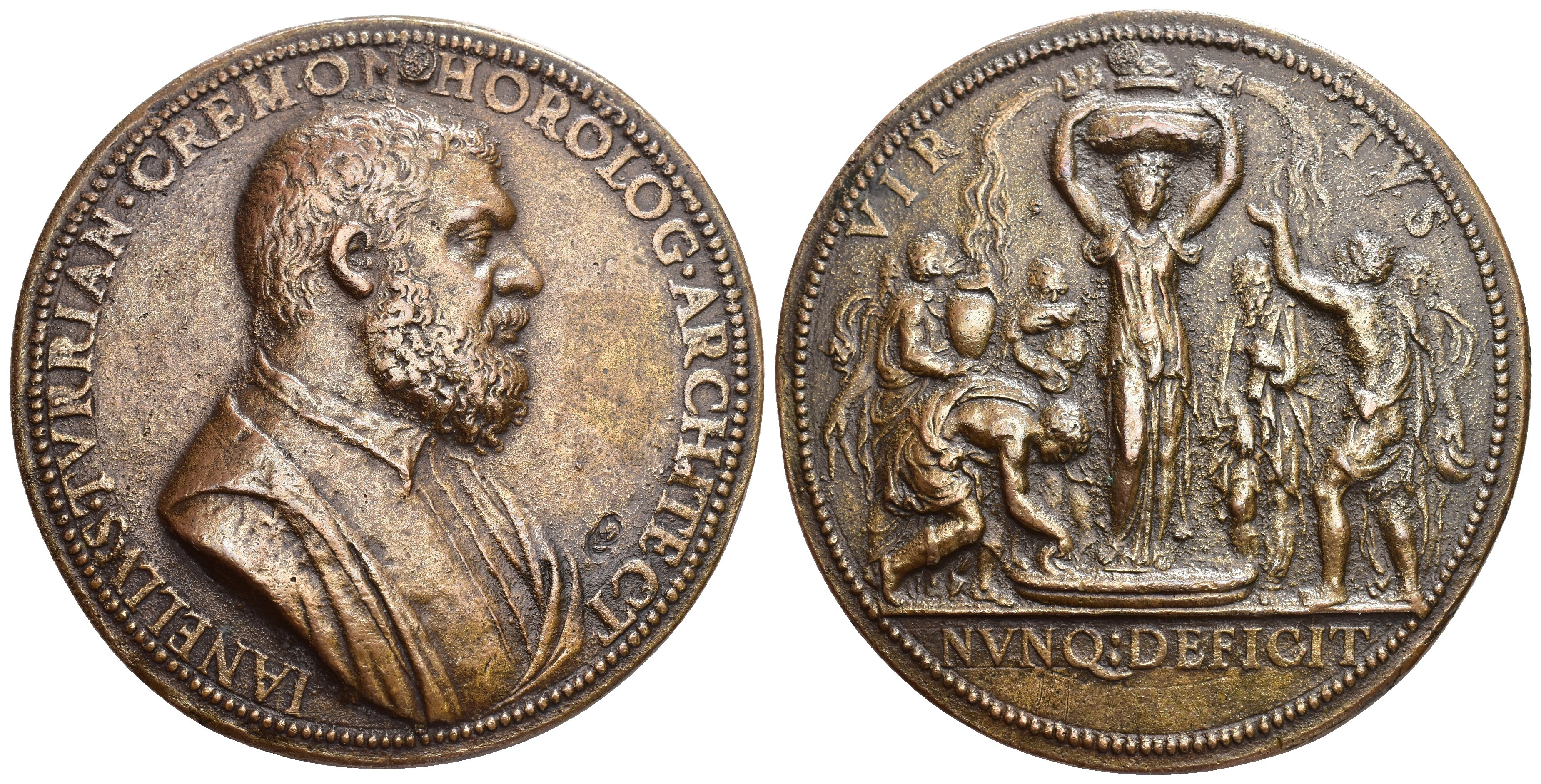CARLOS I. Medalla. La fuente de las Ciencias. A/ Busto de Juanelo Turriano a der.; IANELLVS TVRRIAN CREMON HOROLOG ARCHITECT. R/ La Fuente de las ciencias, representada como una mujer con una fuente sobre su cabeza de la que manan chorros a ambos lados que recogen varias figuras masculinas; VIR - TVS, exergo NVNQ:DEFICIT. Atribuida a Jacopo da Trezzo (algunos autores a León Leoni). Fundición posterior. AE 160,29 g. 79,6 mm. Álvarez-Ossorio 270, p. 23; RAH-59. EBC-.