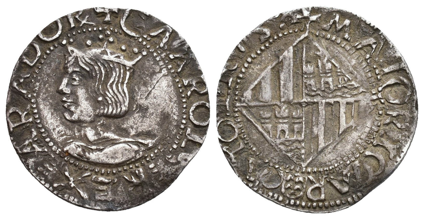 CARLOS I. Real. Mallorca. Escudito con crecientes. AR 2,22 g. 22,2 mm. AC-65. Ligera doble acuñación. Rayita. MBC.