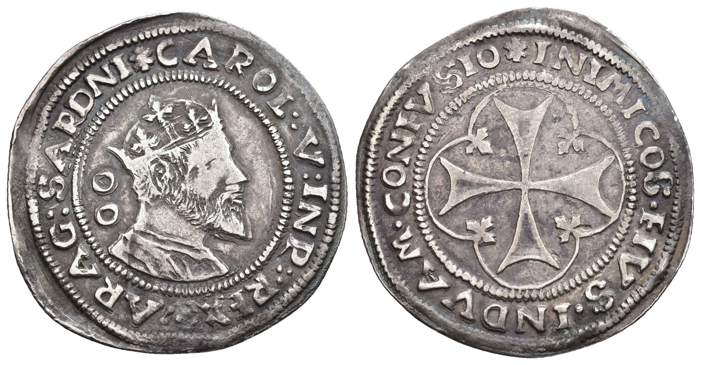 CARLOS I. 2 reales. Cagliari. AR 4,86 g. 31,3 mm. Vti.-332; Varesi-32. MBC-/MBC.