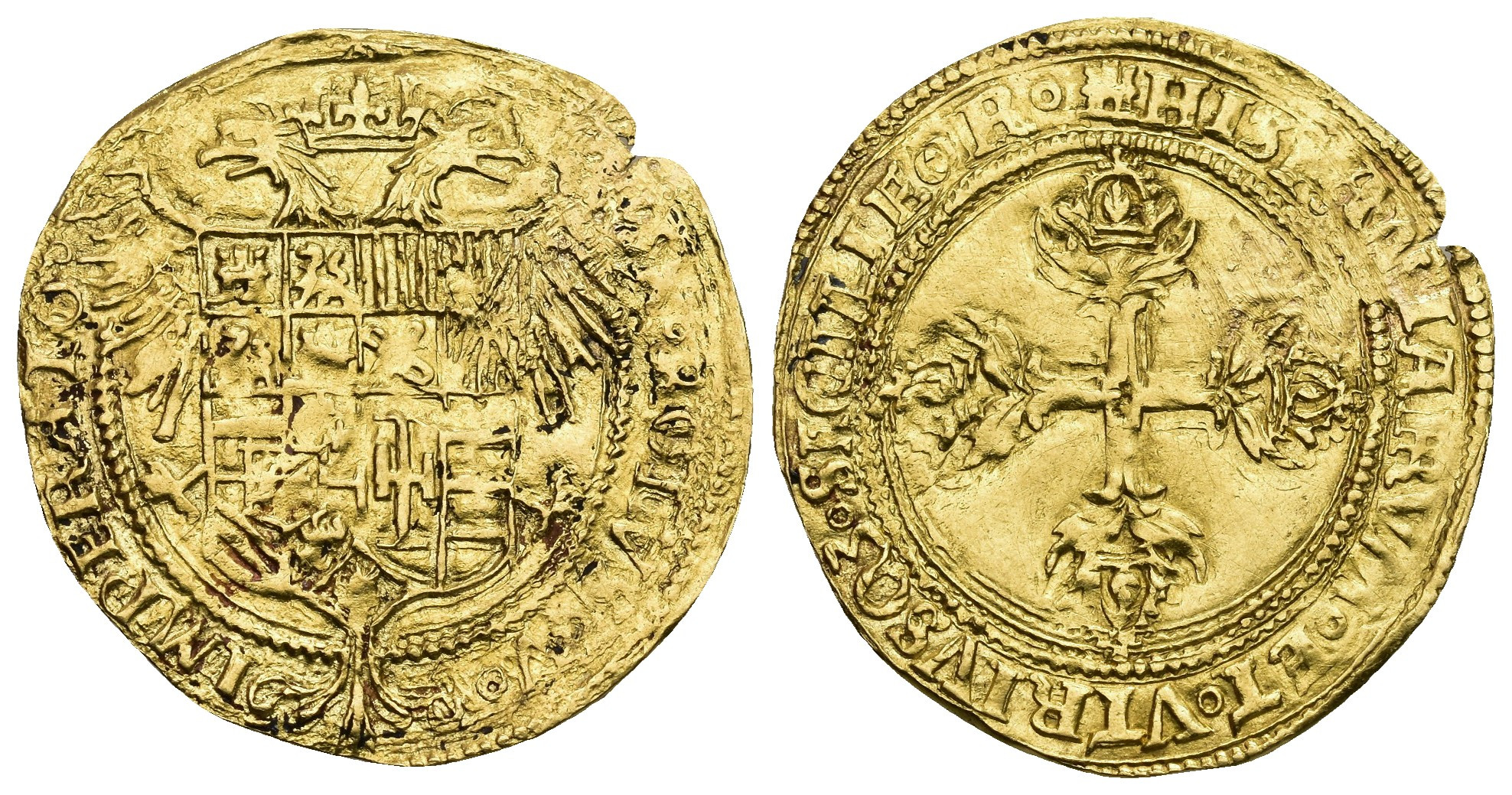 CARLOS I. Escudo de oro (1535). Barcelona. Para la expedición de Túnez. AU 3,36 g. 27,5 mm. AC-120. Cospel ligeramente abierto. MBC.