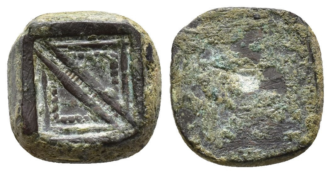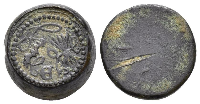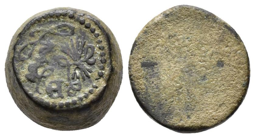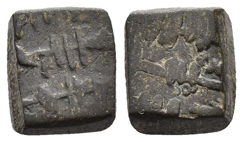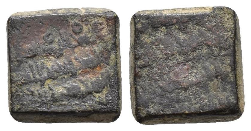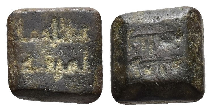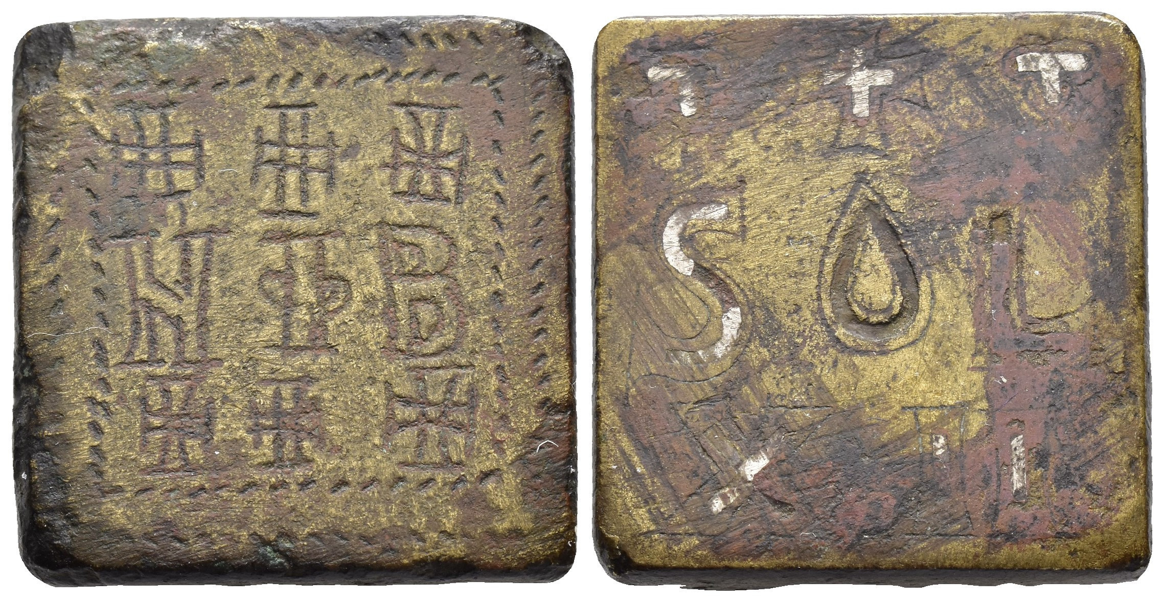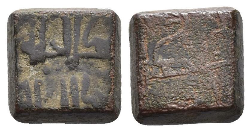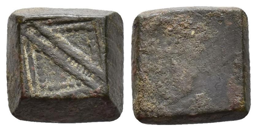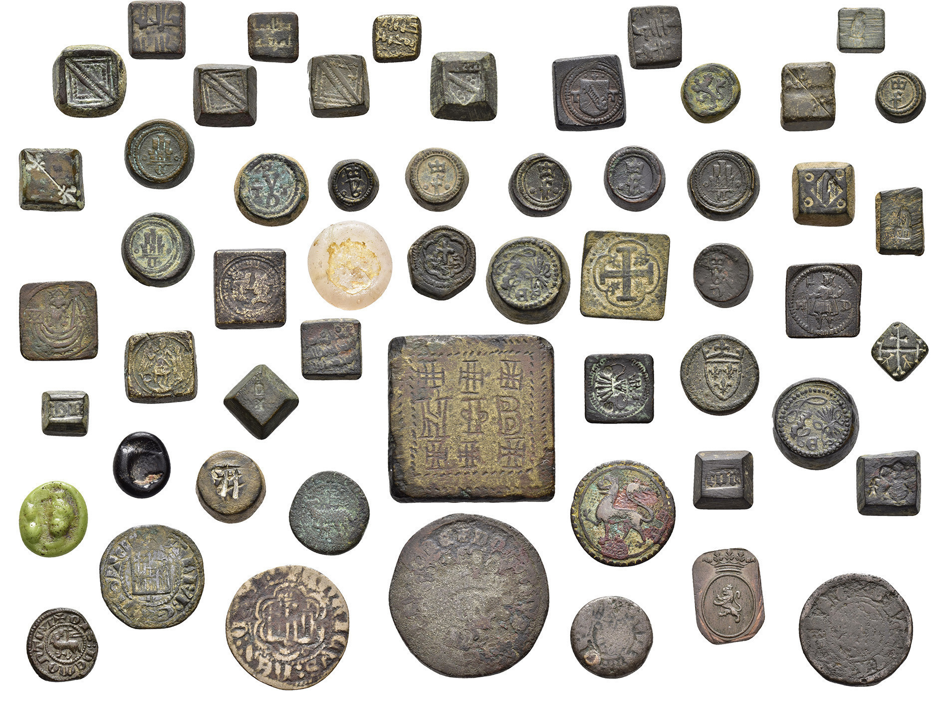 FELIPE II. Interesante conjunto de 55 piezas, compuesto por: 1 ponderal bizantino (47,5 g); 5 ponderales árabes (3 para doblas y 2 para medias doblas); 21 ponderales castellanos: 2 para Excelente, 3 para Dobla de la Banda, 1 para media Dobla de la Banda, 2 para Dobla de la Banda (diferente tipo, escudo), 2 para Dobla de la Banda (diferente tipo, lis), 3 para Castellano, 2 para Ducado, 1 para medio Ducado, 3 para Florín, 1 para medio Florín, 1 para Ducado Valenciano; 15 ponderales europeos: 1 para dos excelentes de Reyes Católicos, 1 para Agnus Dei francés, 10 para Ducados europeos y 3 para medios Ducados; 5 Pieforts: 1 para Real de Vellón de Enrique II (17,11 g), 1 para dinero de Fernando IV (7,82 g), 1 para dinero de Alfonso X (2,71 g), 1 para blanca de Enrique III (4,27 g) y 1 para dinero de Aragón de Jaime (3,96 g); 4 piezas indeterminadas y 3 fichas de cristal. De BC a MBC+.