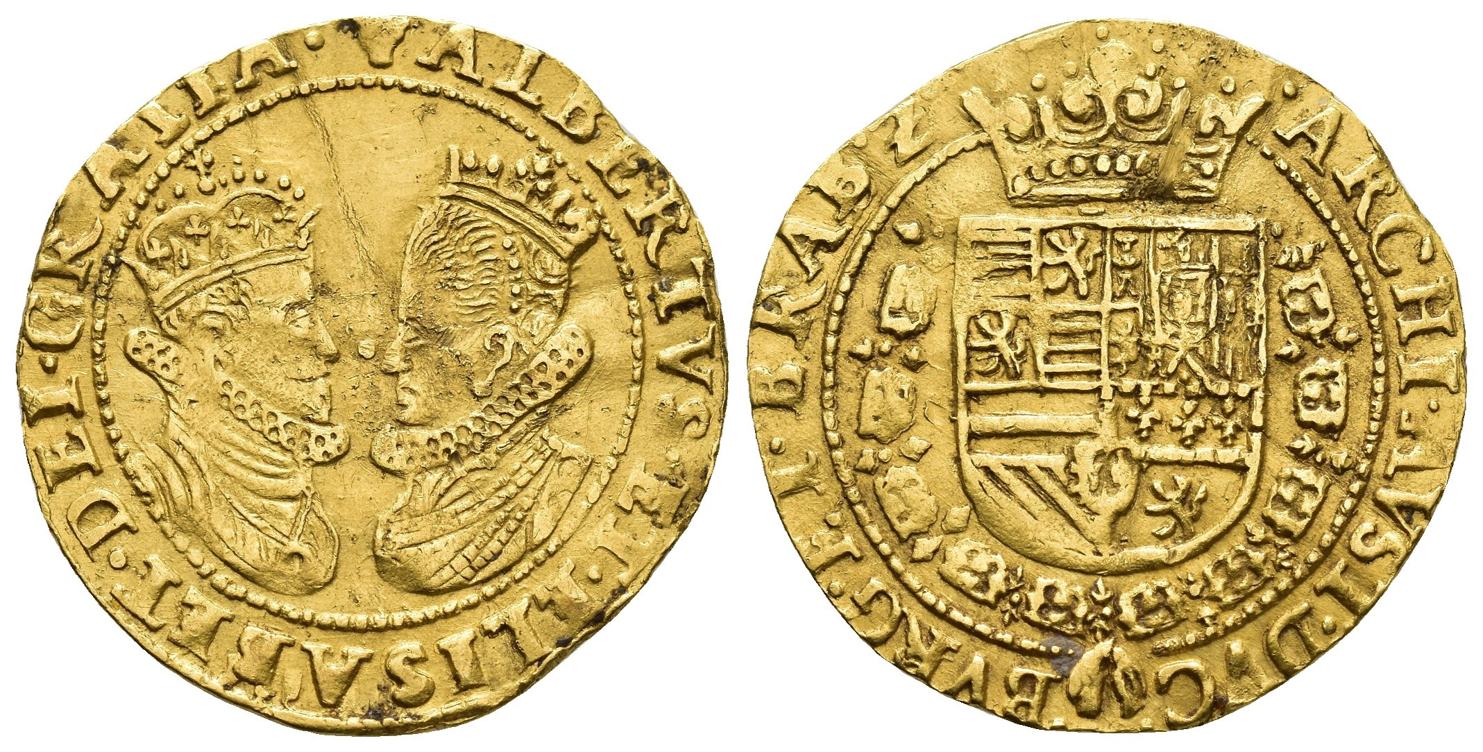 ALBERTO E ISABEL. 2 ducados. S.F. Amberes. AU 6,91 g. 28,7 mm. Delm-142. Vanhoudt-580.AN. Desdoblada. Raya en rev. MBC.