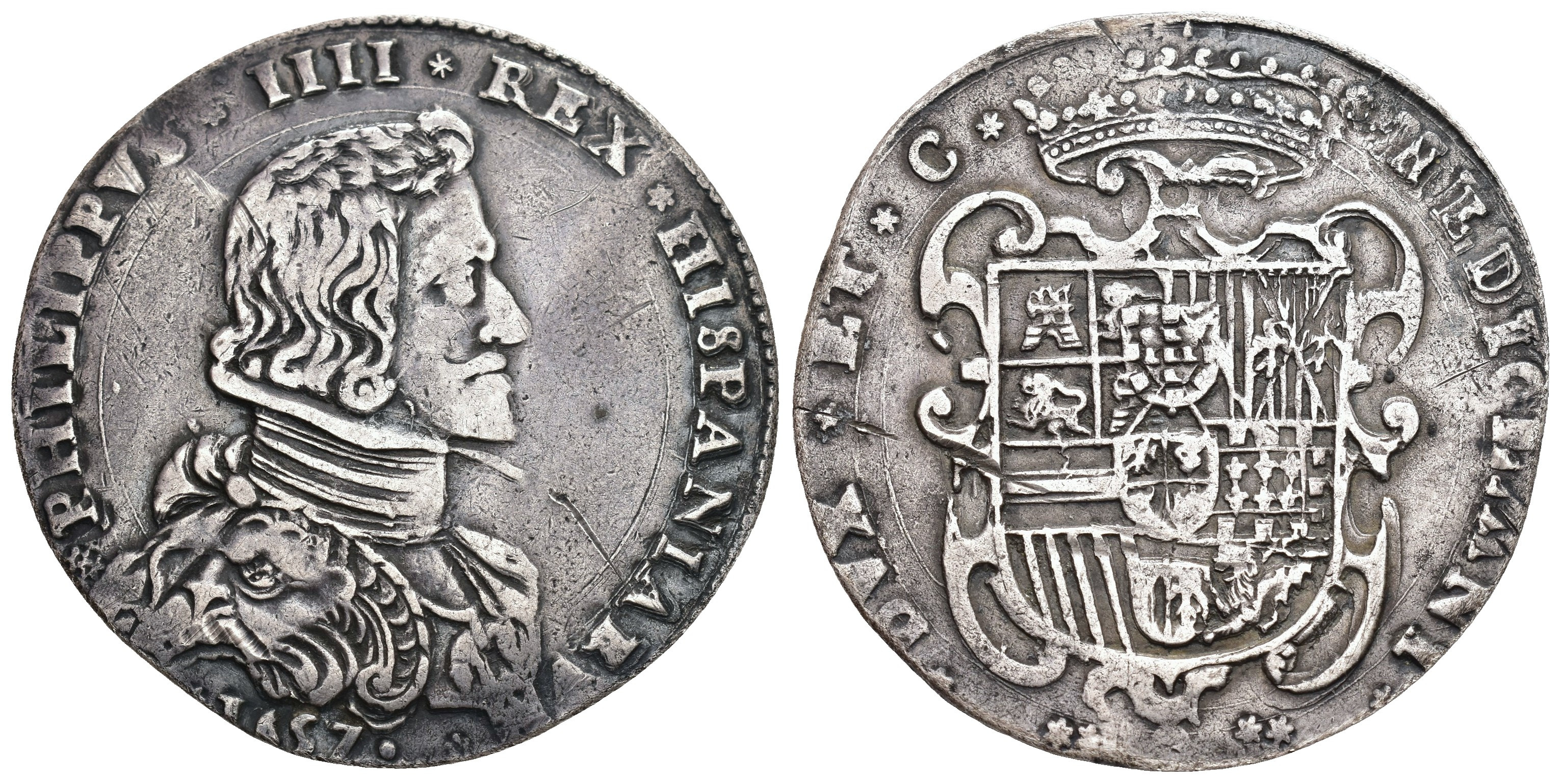 FELIPE IV. Ducatón. 1657. Milán. AR 26,78 g. 41,5 mm. Olivares-244. Rayas en anv. y rev. MBC.