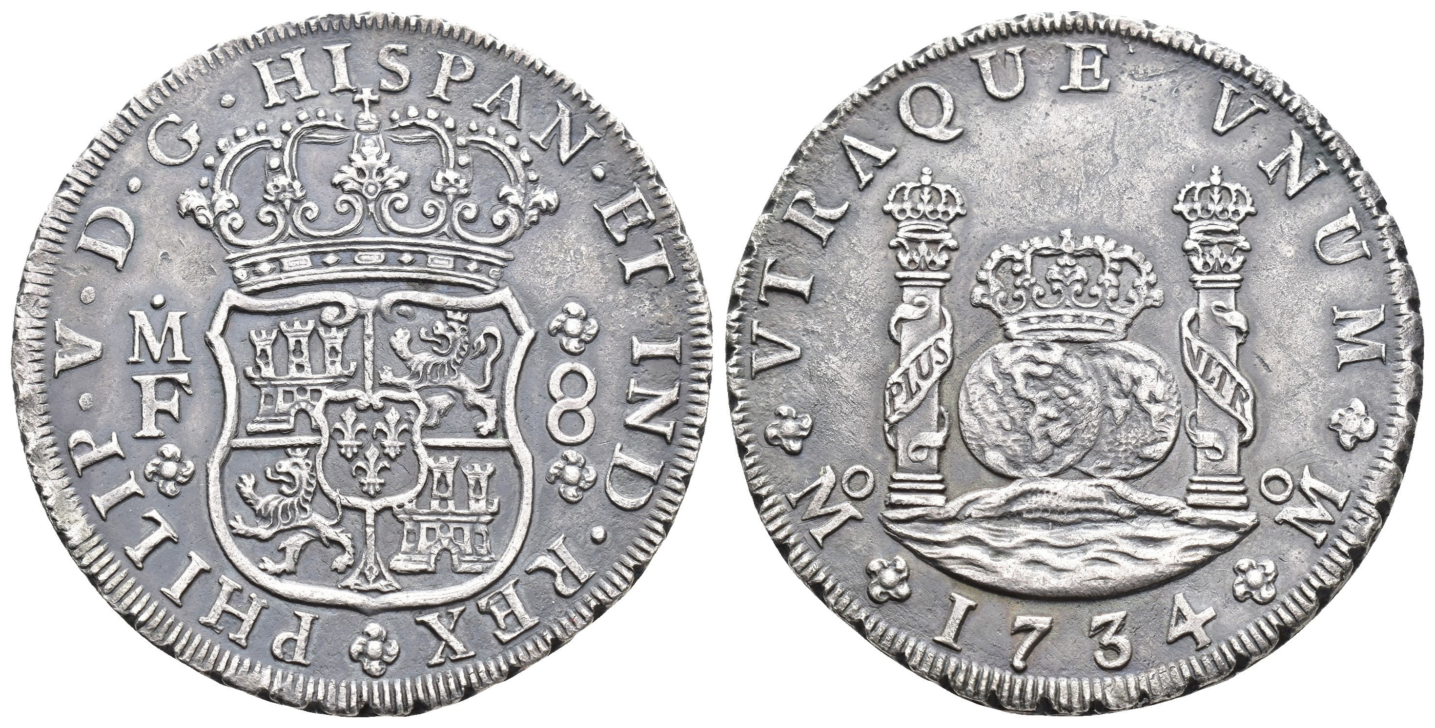 FELIPE V. 8 reales. 1734. México. MF. AR 26,37 g. 40,4 mm. VI-1142; AC-1442. Leves oxidaciones marinas. MBC+.
