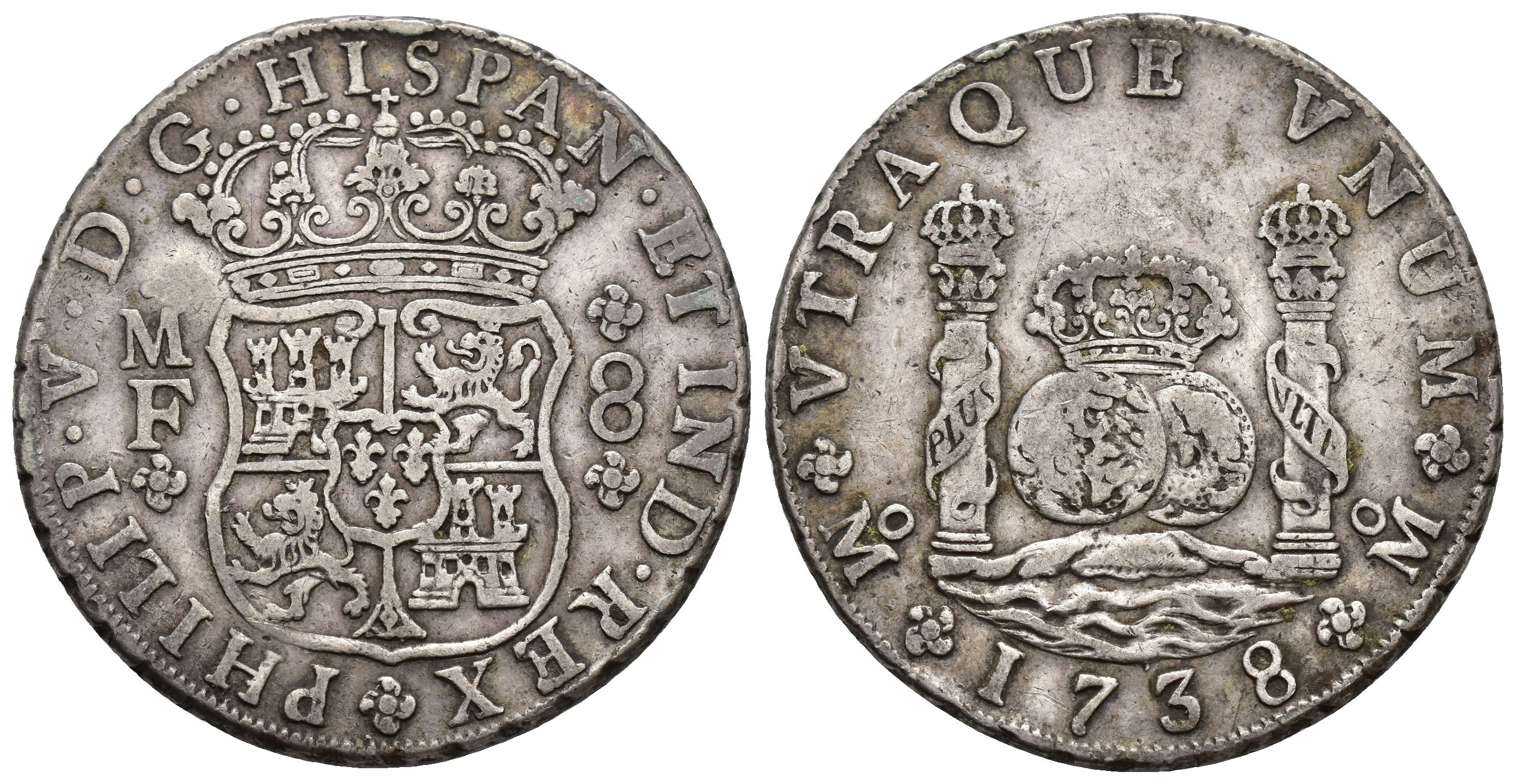 FELIPE V. 8 reales. 1738. México. MF. AR 26,85 g. 37,9 mm. VI-1146; AC-1449. MBC.