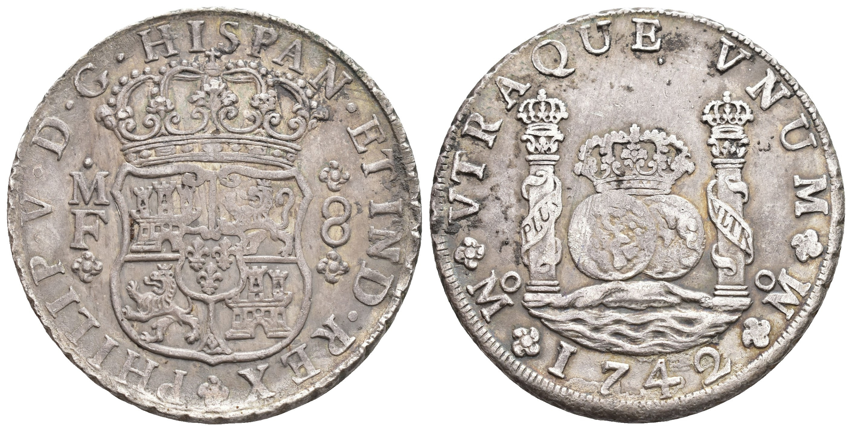 FELIPE V. 8 reales. 1742. México. MF. AR 26,75 g. 38,3 mm. VI-1150; AC-1461. Leves oxidaciones y finas rayas de ajuste. MBC.