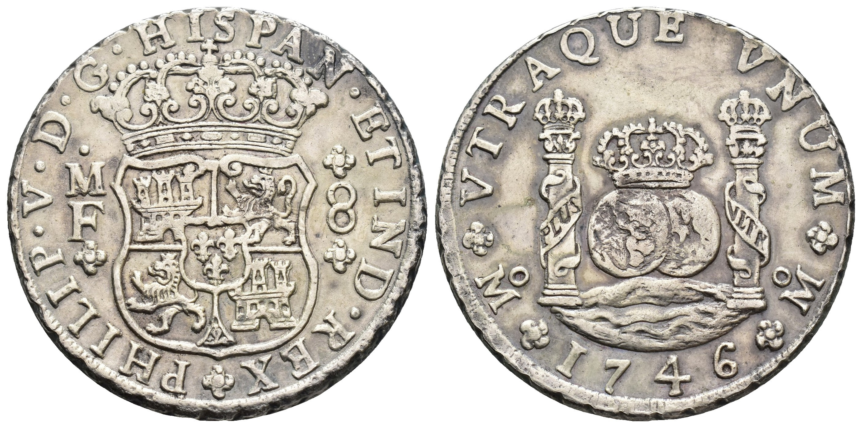 FELIPE V. 8 reales. 1746. México. MF. AR 26,93 g. 38,2 mm. VI-1154; AC-1470. MBC+/MBC.