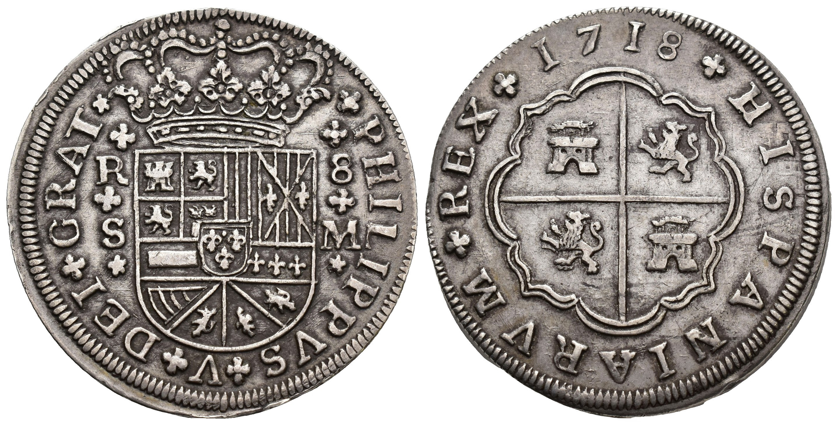 FELIPE V. 8 reales. 1718. Sevilla. M. AR 24,55 g. 39,3 mm. VI-1258; AC-1617. Defectos de cospel en canto. MBC+. Escasa.