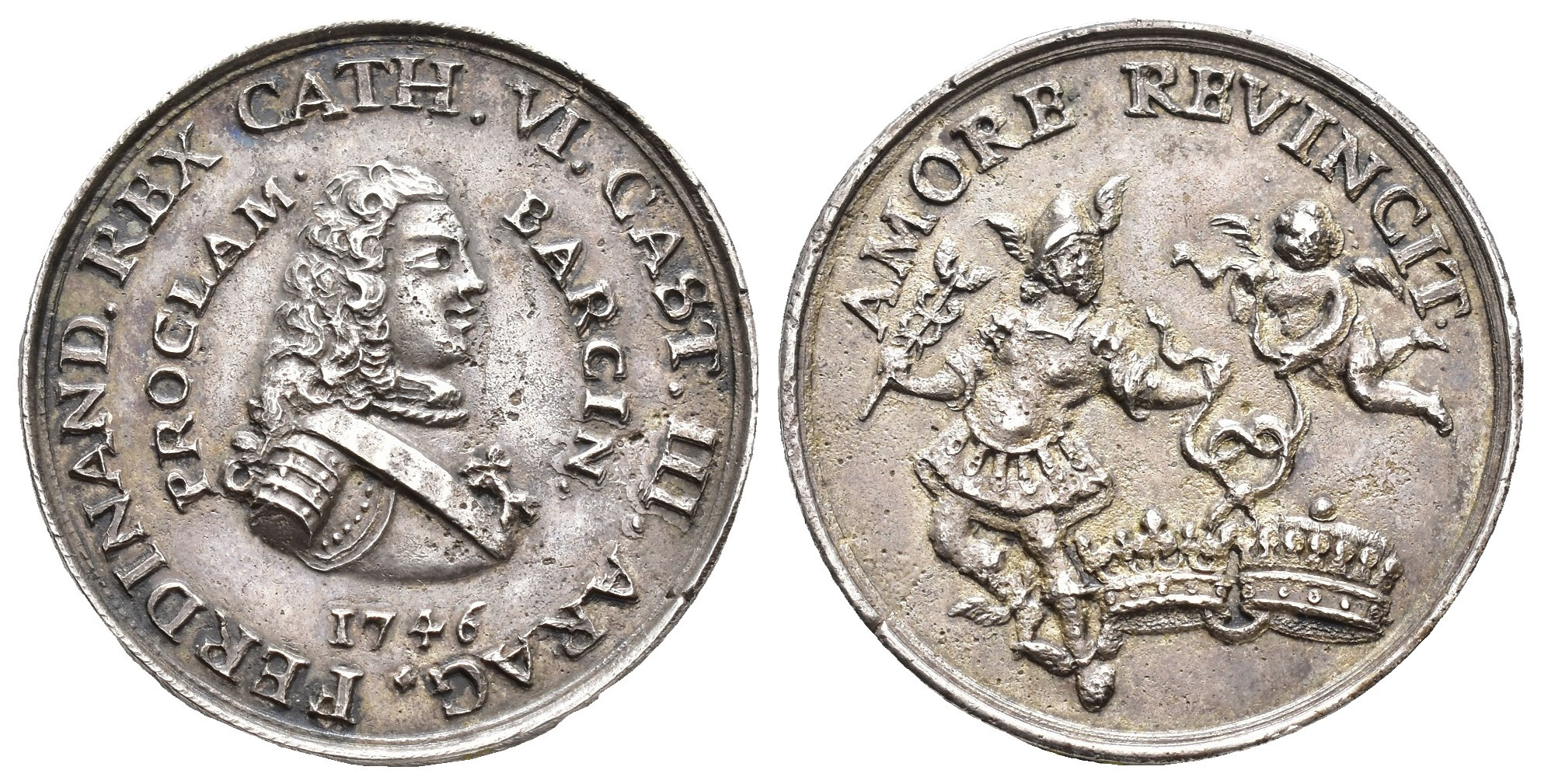 FERNANDO VI. Medalla de proclamación. 1746. Barcelona. Módulo 2 reales. Herrera-1. Fundida. AR 5,16 g. 27 mm. Pequeños defectos de cospel. EBC-. Escasa.