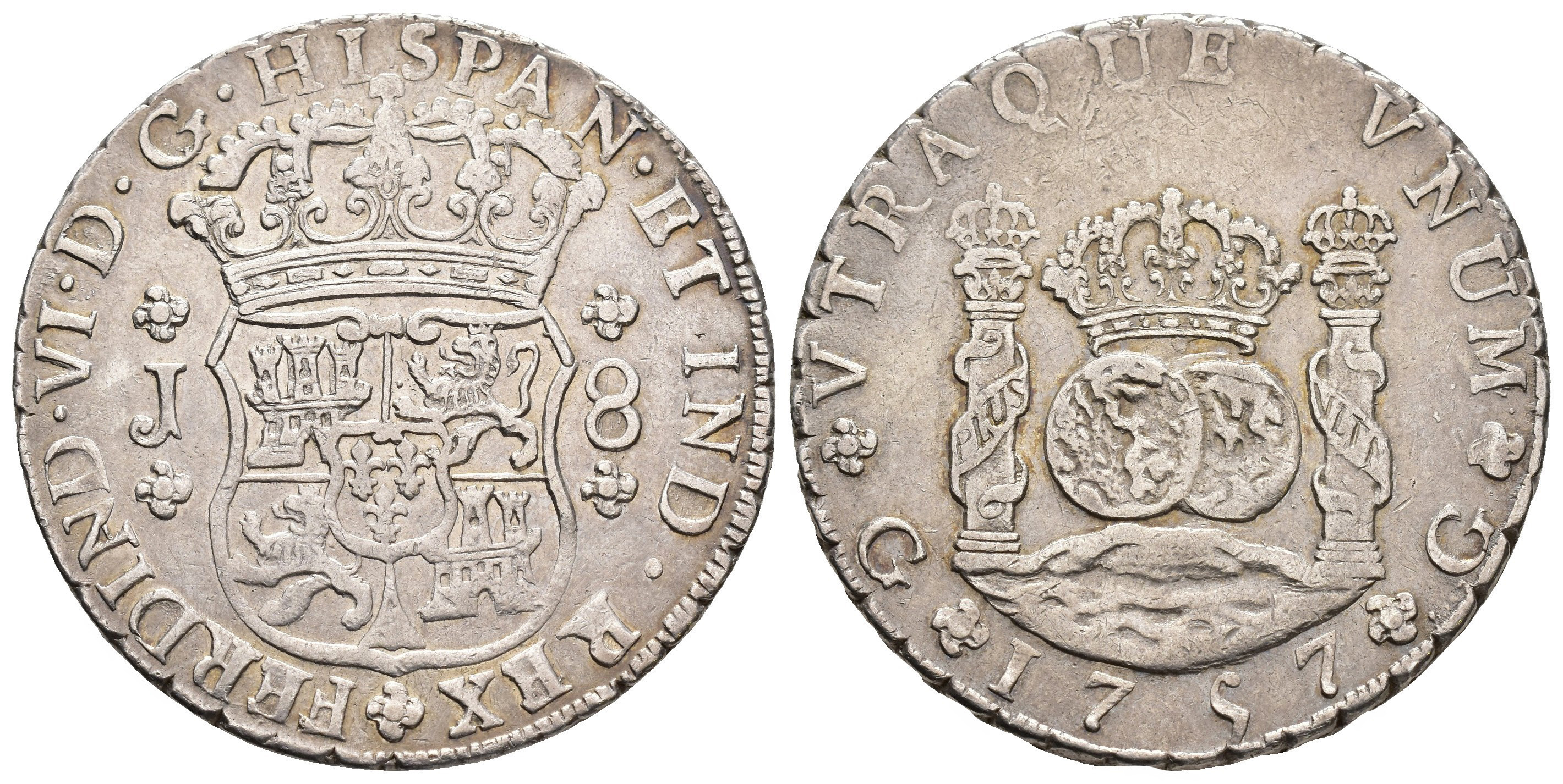 FERNANDO VI. 8 reales. 1757. Guatemala. J. AR 26,95 g. 38,6 mm. VI-333; AC-434. EBC-. Muy escasa.