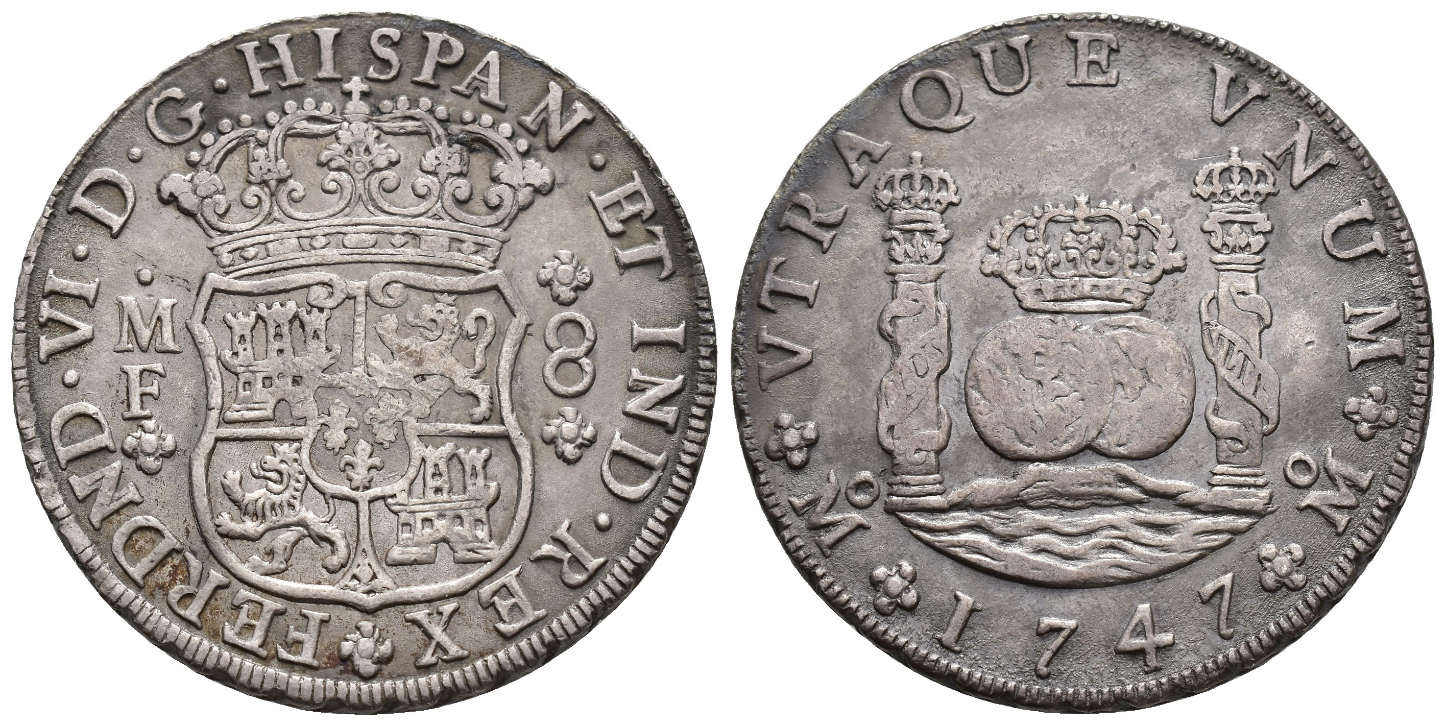 FERNANDO VI. 8 reales. 1747. México. MF. AR 26,6 g. 38,6 mm. VI-355; AC-469. Acuñación floja en el centro del anv. MBC+.