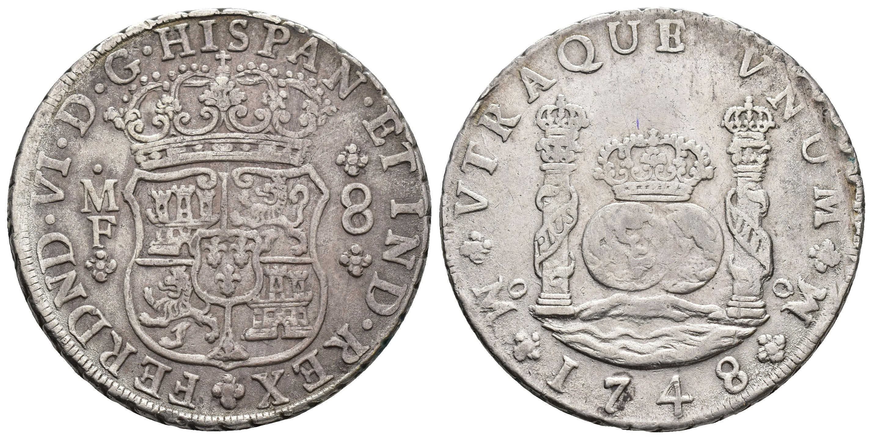 FERNANDO VI. 8 reales. 1748. México. MF. AR 26,93 g. 38,7 mm. VI-356; AC-471. MBC.
