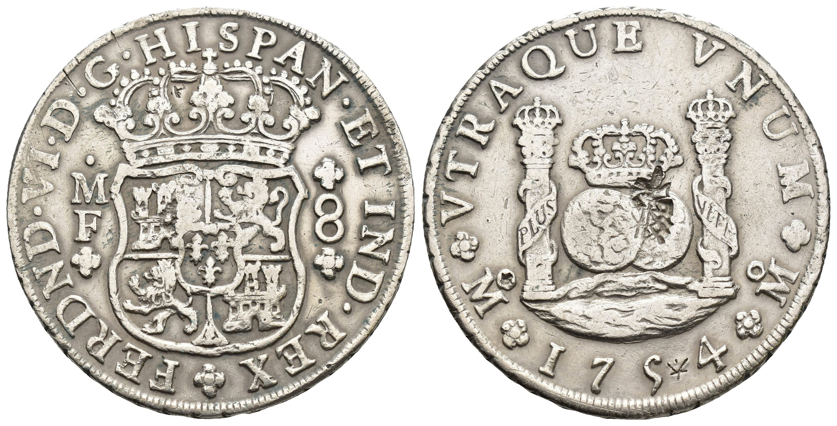 FERNANDO VI. 8 reales. 1754. México. MF. Coronas reales. AR 26,74 g. 39,5 mm. VI-362; AC-482. Resello chino. MBC.