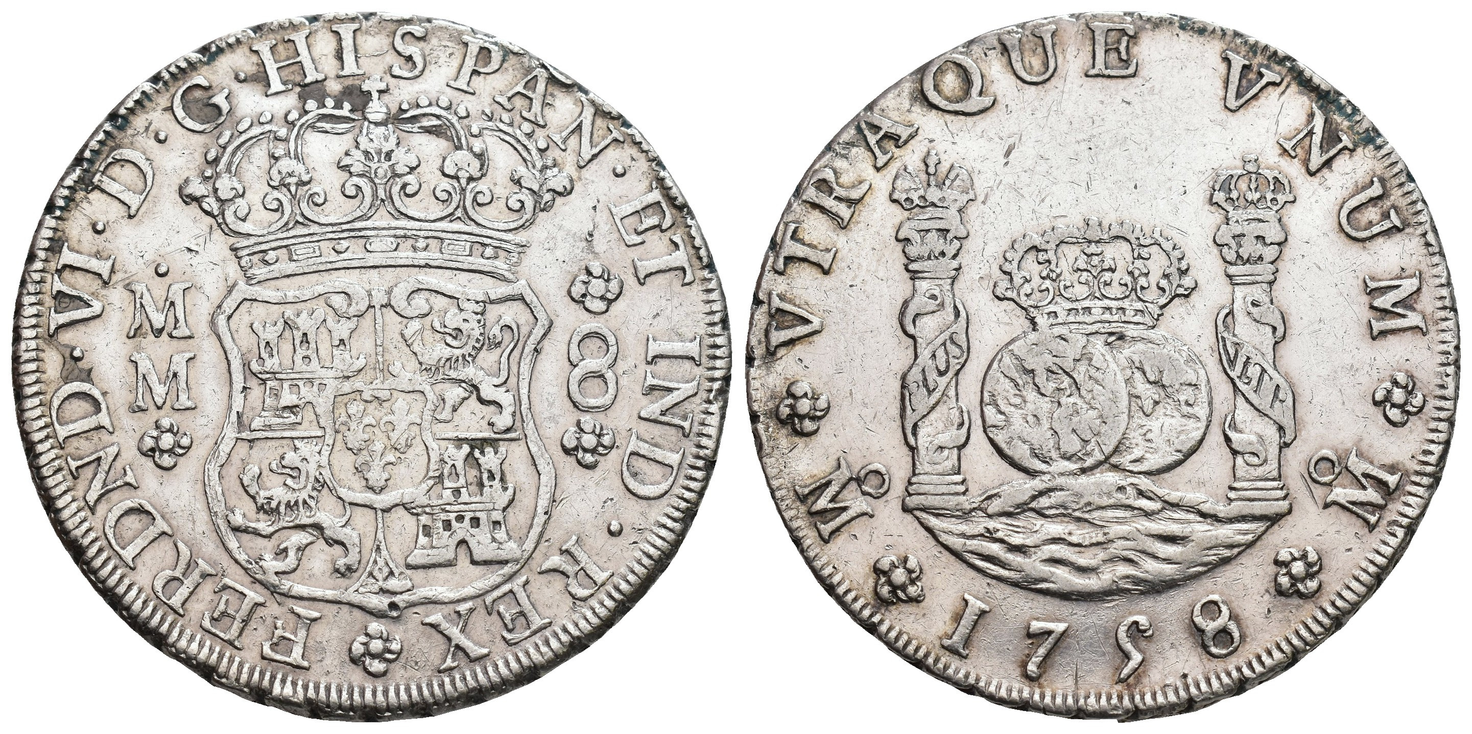 FERNANDO VI. 8 reales. 1758. México. MM. AR 26,8 g. 38,9 mm. VI-369; AC-494. Pequeñas marcas. MBC+.