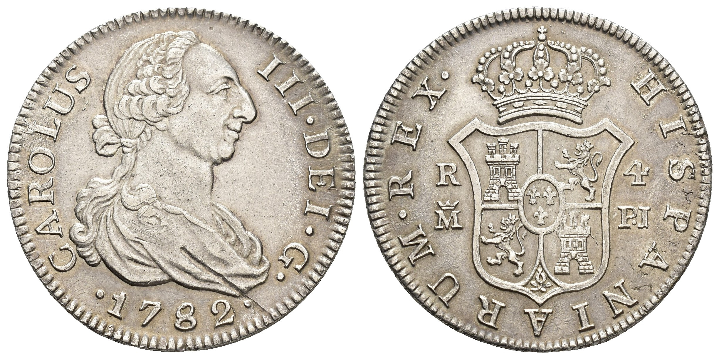 CARLOS III. 4 reales. 1782/0. Madrid. PJ. AR 13,24 g. 32,6 mm. VI-738 var.; AC-865. Raya en anv. EBC-.