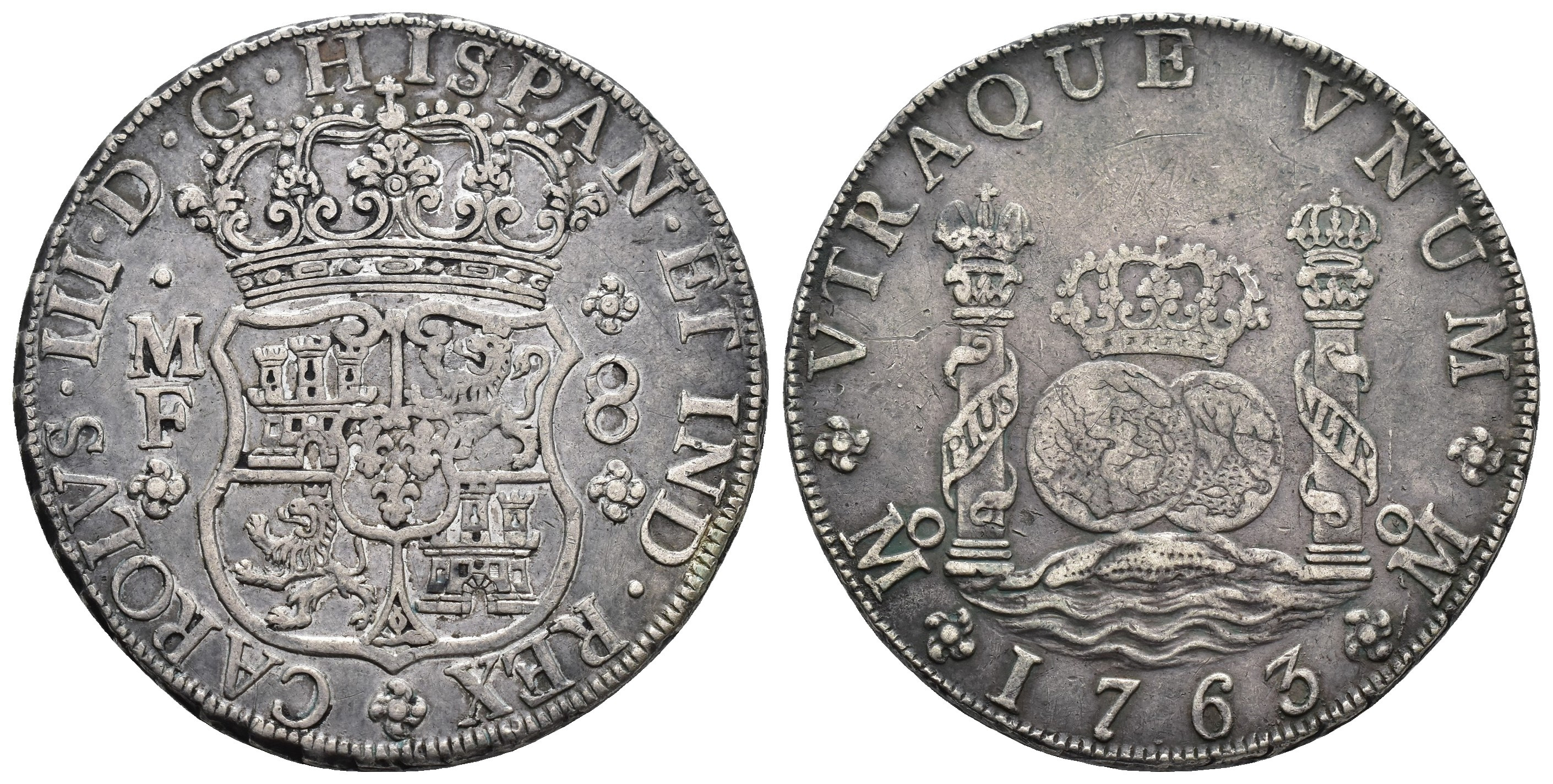 CARLOS III. 8 reales. 1763. México. MF. AR 27,09 g. 38,3 mm. VI-921; AC-1086. Rayitas. MBC/MBC-.