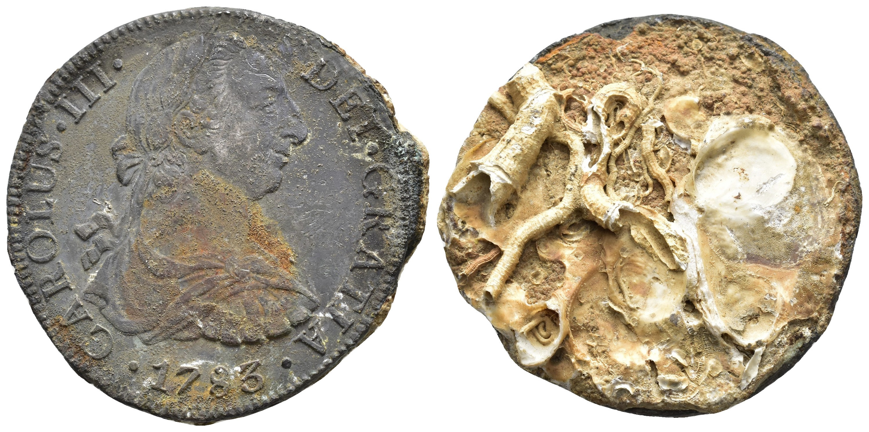 CARLOS III. 8 reales. 1783. México. AR 28,42 g. 38,7 mm. VI-tipo 91. Concreciones marinas. MBC-.