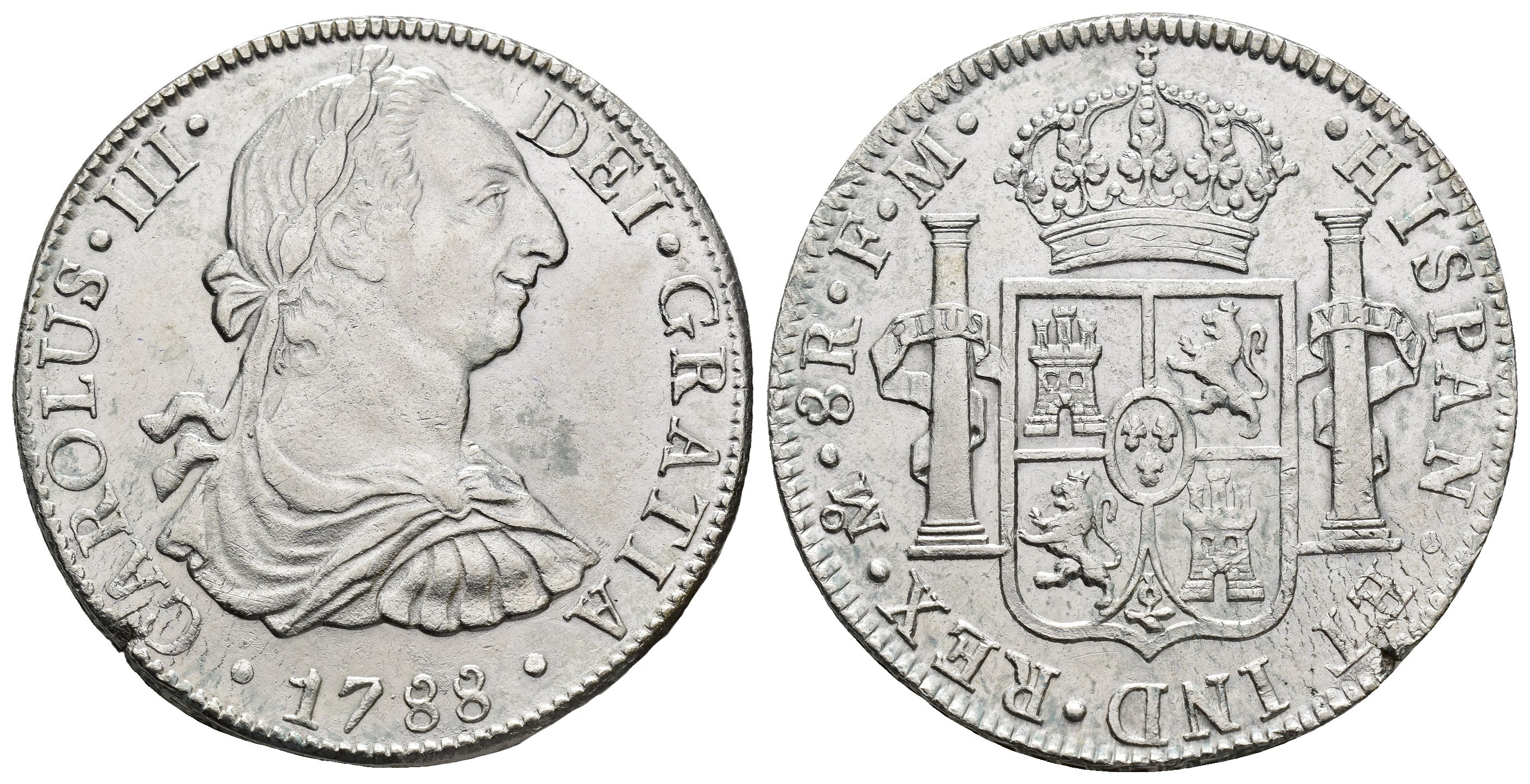 CARLOS III. 8 reales. 1788. México. FM. AR 26,75 g. 38,4 mm. VI-953; AC-1132. Cospel ligeramente abierto. Limpiada. EBC-.