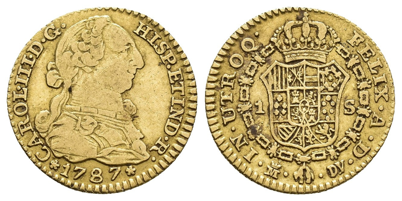 CARLOS III. Escudo. 1787. Madrid. DV. AU 3,44 g. 17,5 mm. VI-1129; AC-1370. MBC-/MBC.