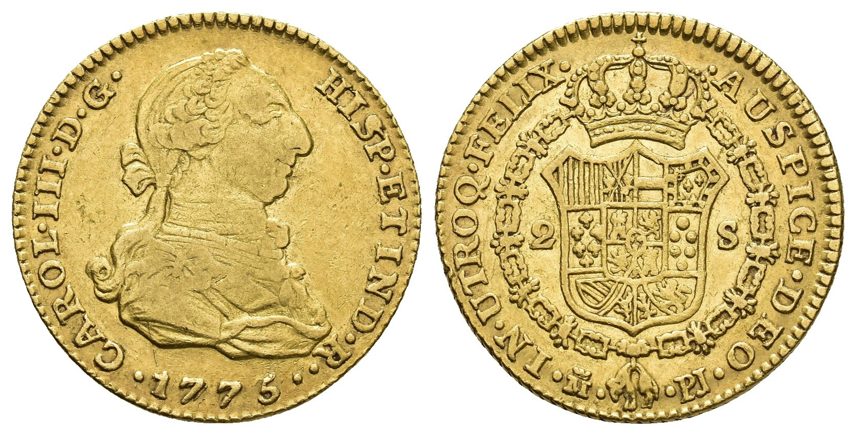 CARLOS III. 2 escudos. 1775. Madrid. PJ. AU 6,71 g. 22,1 mm. VI-1287; AC-1549. Pequeñas marcas. MBC.