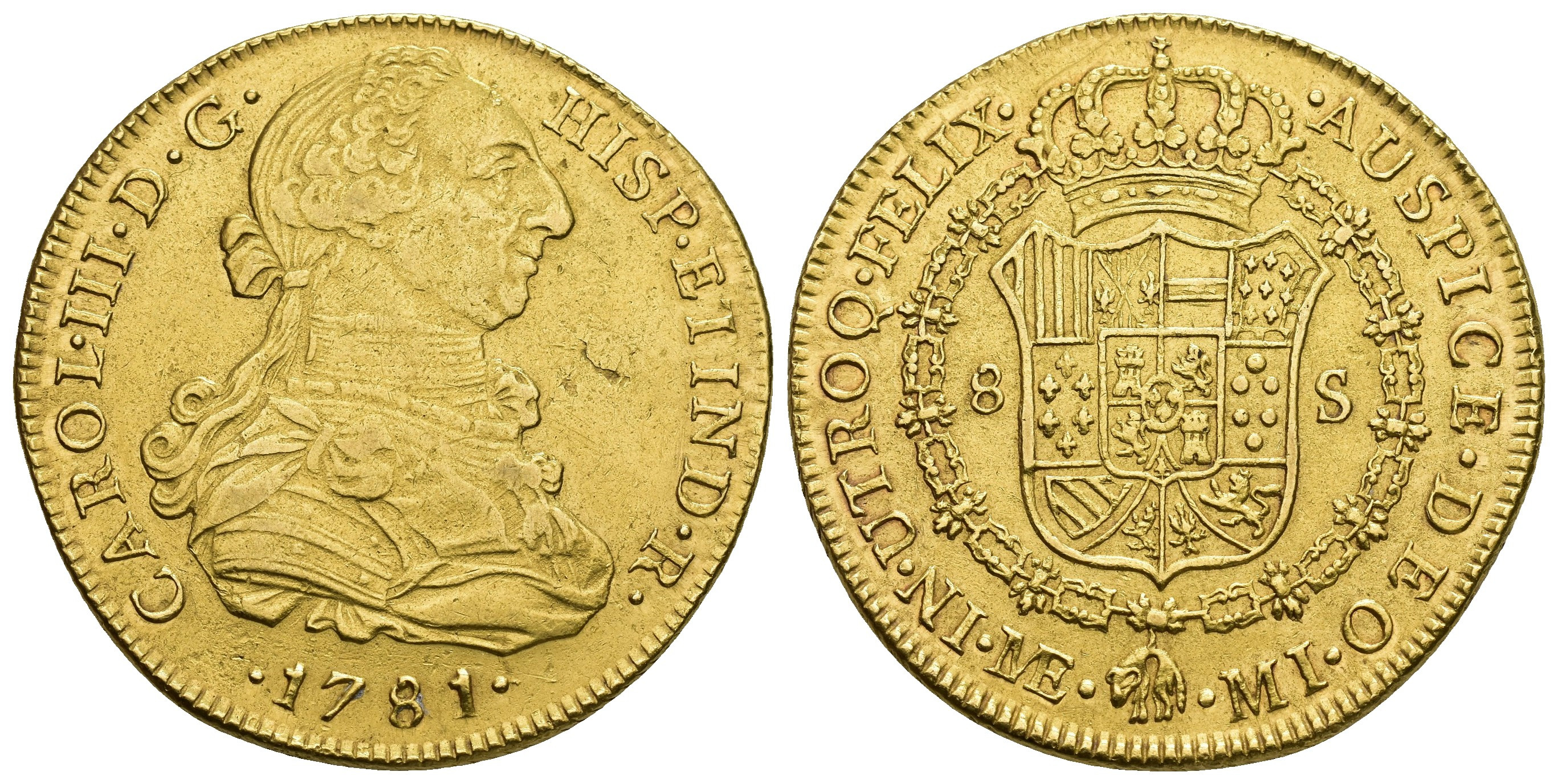 CARLOS III. 8 escudos. 1781. Lima. MI. AU 26,98 g. 37 mm. VI-1608; AC-1943. Cuño del anv. oxidado. MBC/MBC+.