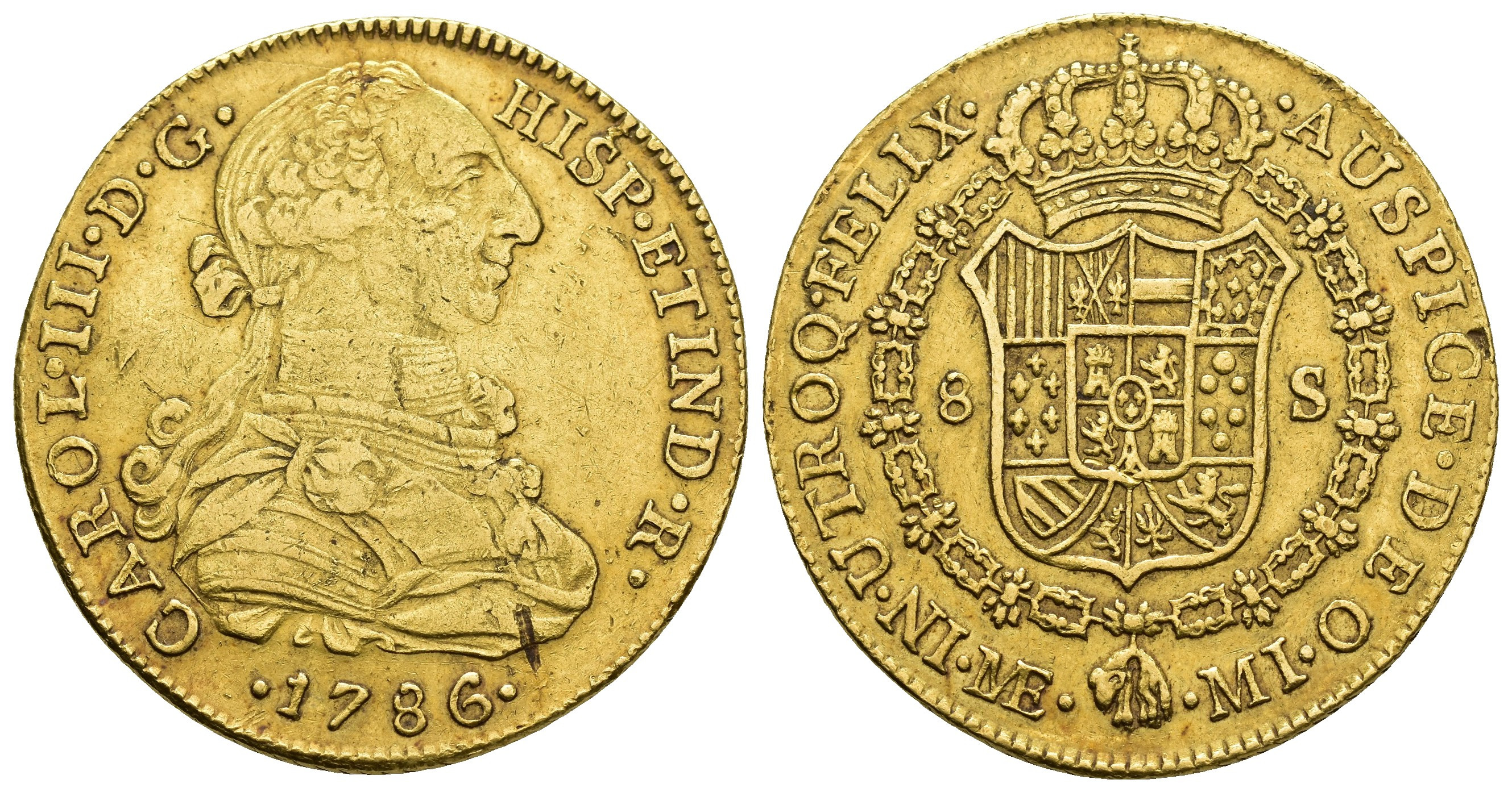 CARLOS III. 8 escudos. 1786. Lima. MI. AU 26,98 g. 37,5 mm. VI-1613; AC-1949. Pequeñas marcas. MBC-/MBC.