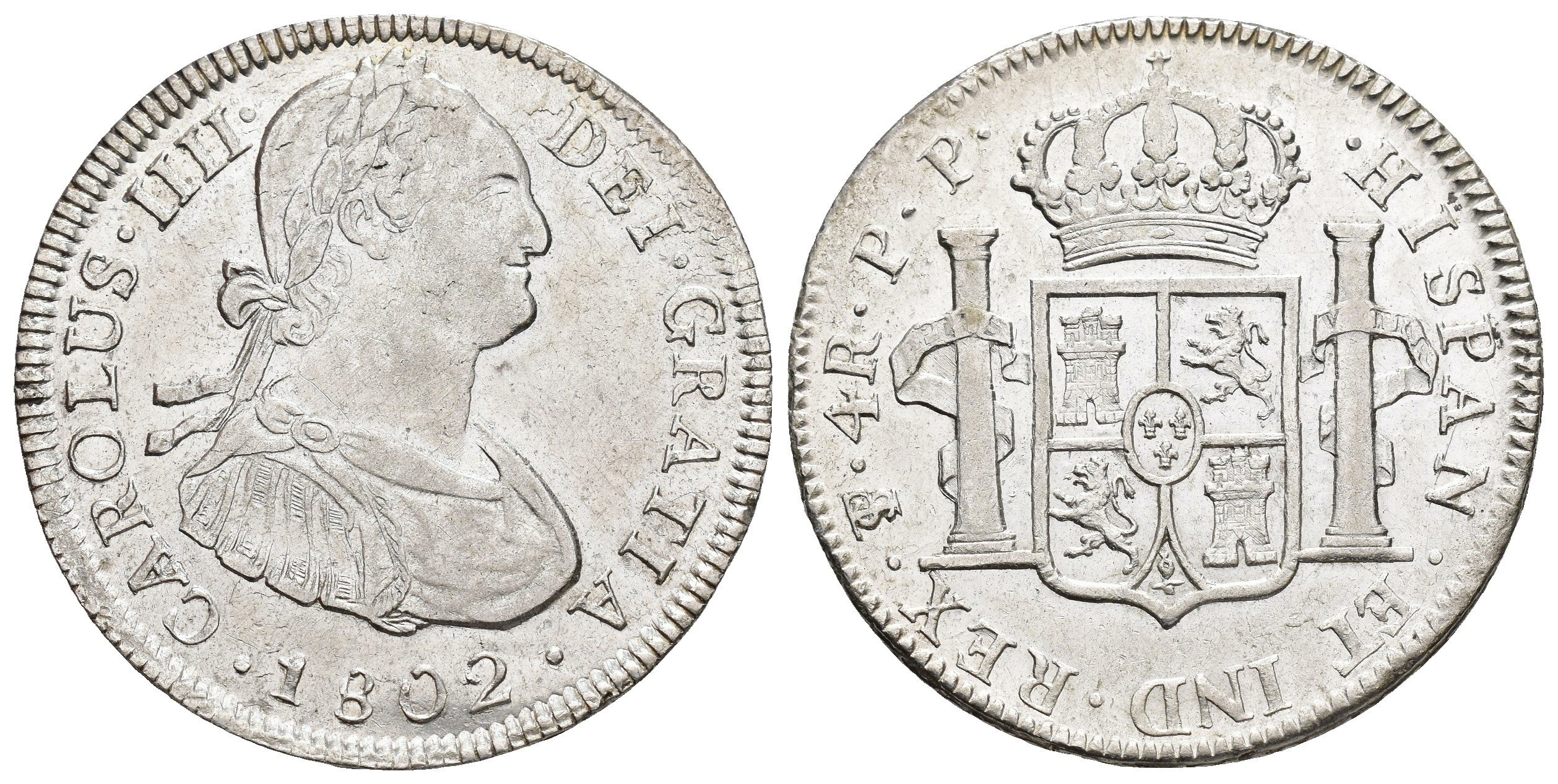 CARLOS IV. 4 reales. 1802. Potosí. PP. AR 13,46 g. 34 mm. VI-697; AC-837. R.B.O. EBC-/EBC.