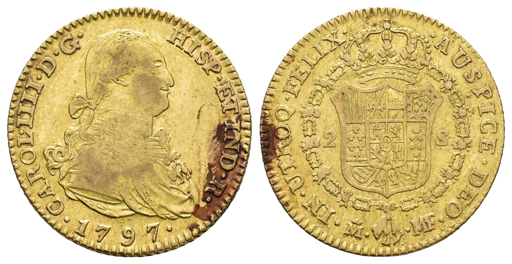 CARLOS IV. 2 escudos. 1797. Madrid. MF. AU 6,65 g. 22,2 mm. VI-1046; AC-1289. Concreciones. MBC.