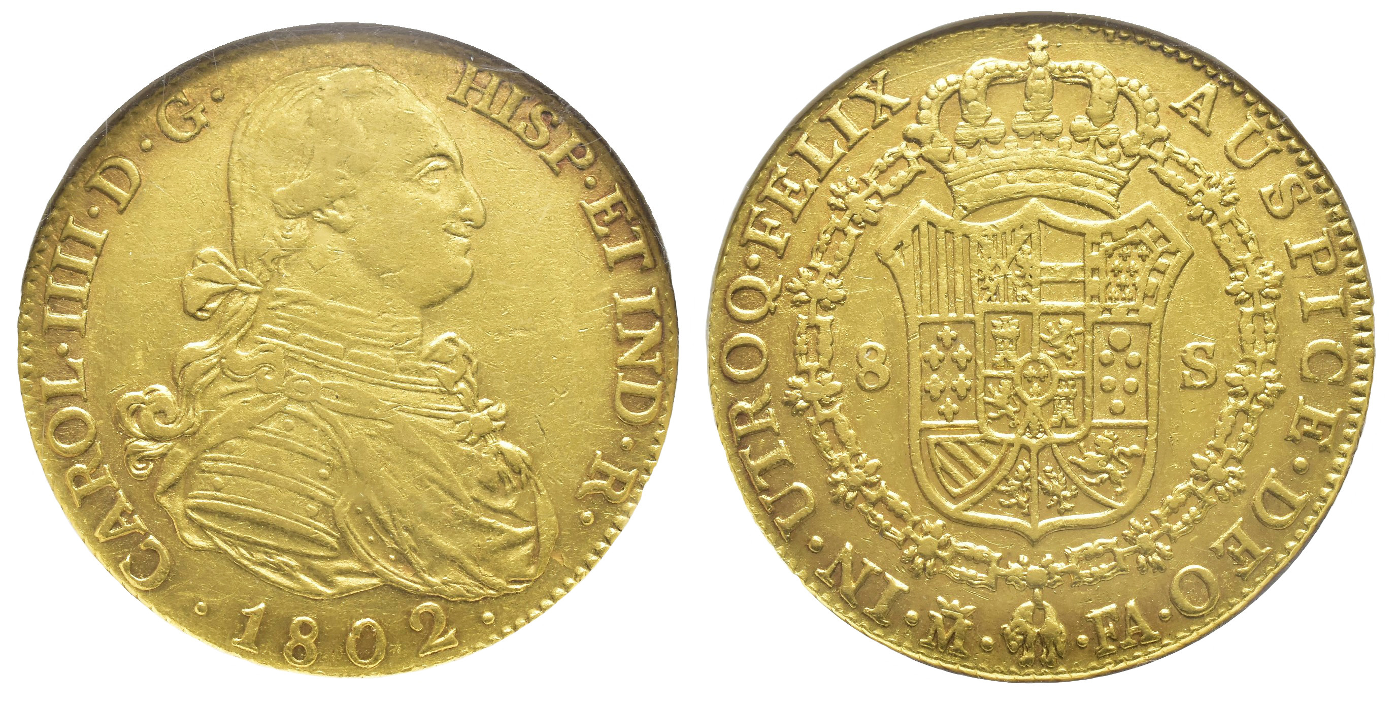 CARLOS IV. 8 escudos. 1802. Madrid. FA. AU g. mm. VI-1321; AC-1621. Encapsulada por NGC-AU 53.