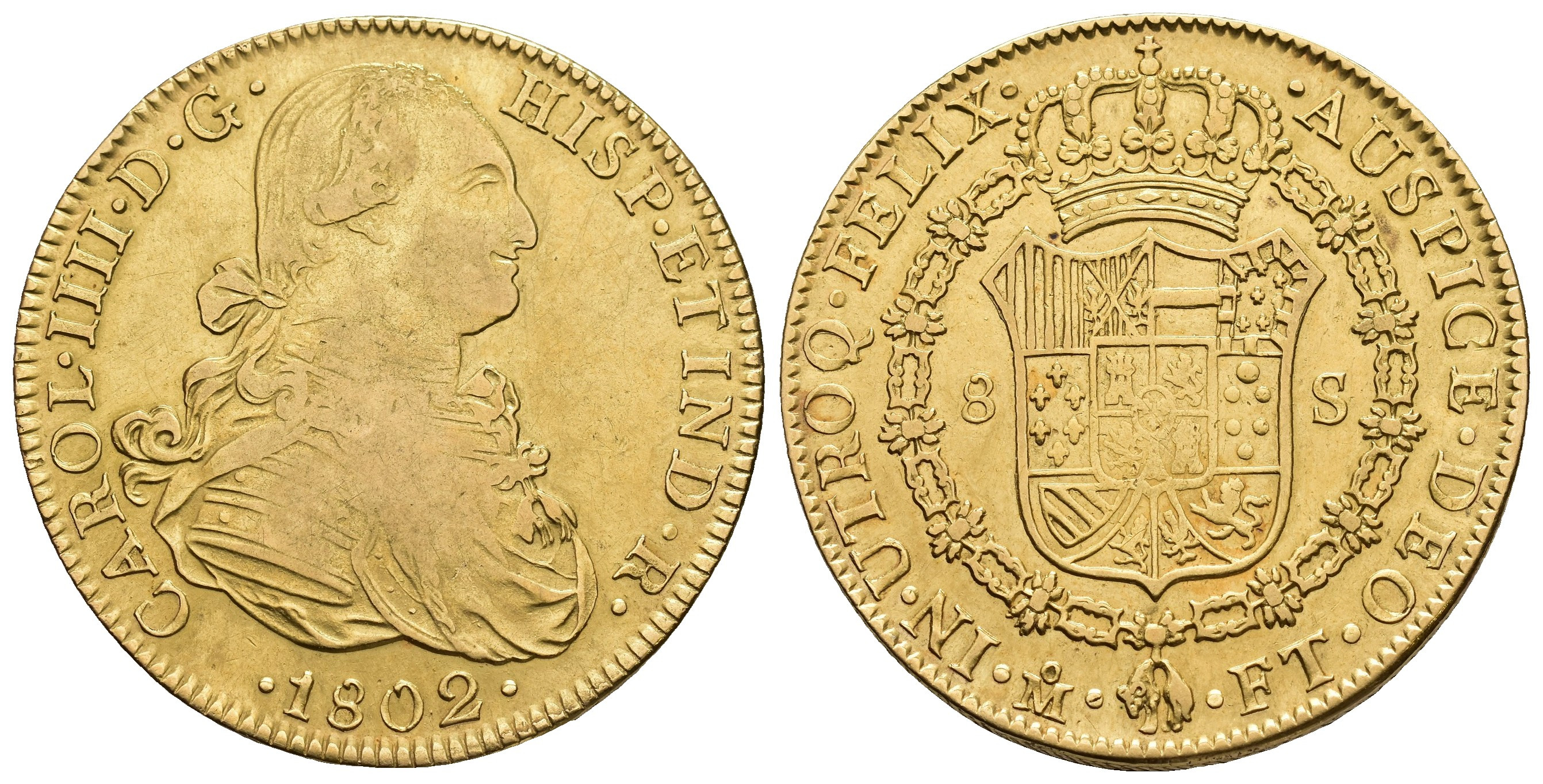 CARLOS IV. 8 escudos. 1802. México. FT. AU 26,94 g. 36,6 mm. VI-1339; AC-1645. Acuñación floja en anv. MBC/MBC+.