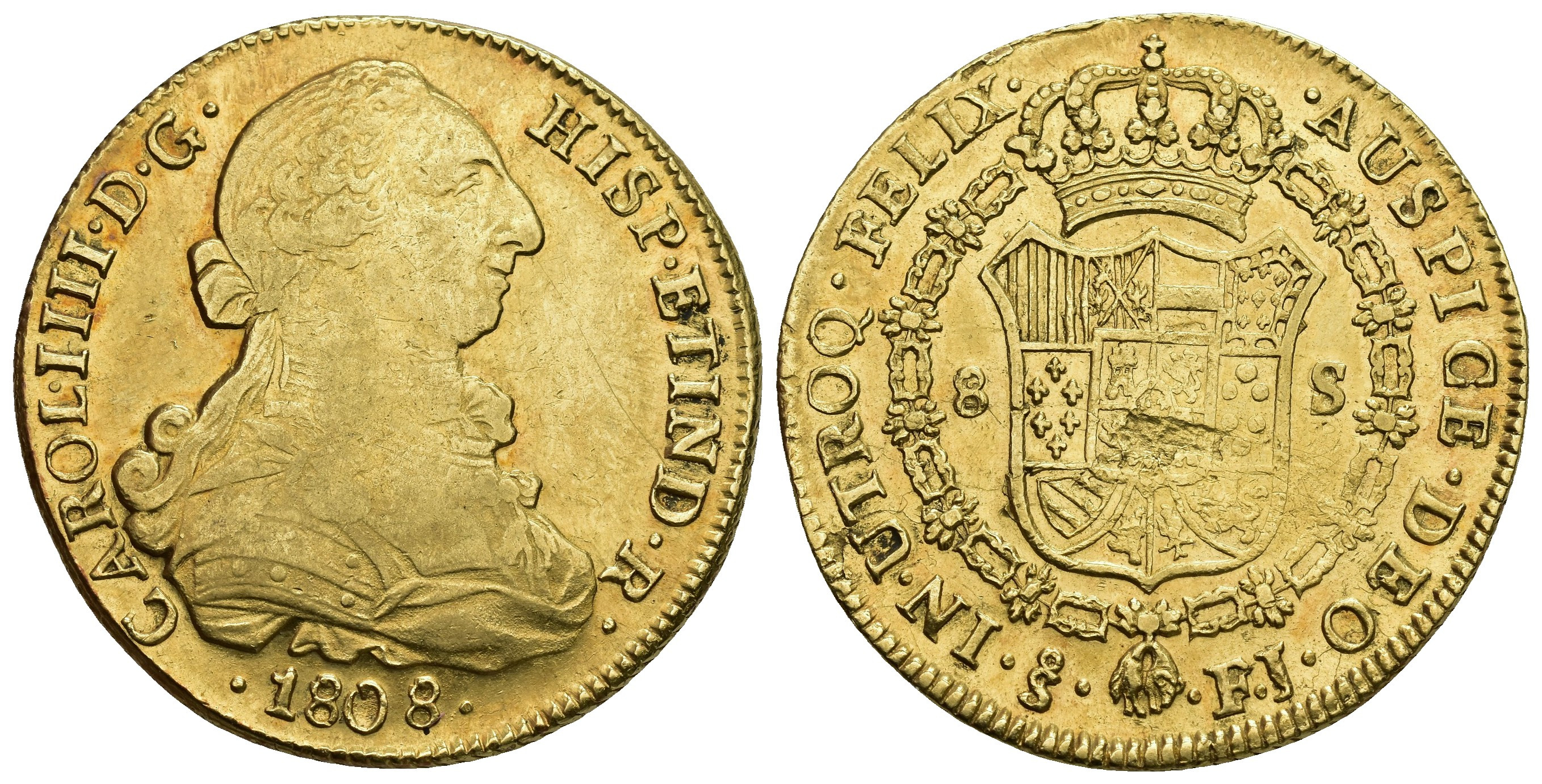 CARLOS IV. 8 escudos. 1808. Santiago. FJ. AU 27 g. 36,9 mm. VI-1436; AC-1782. Hojas en rev. MBC-/MBC+.