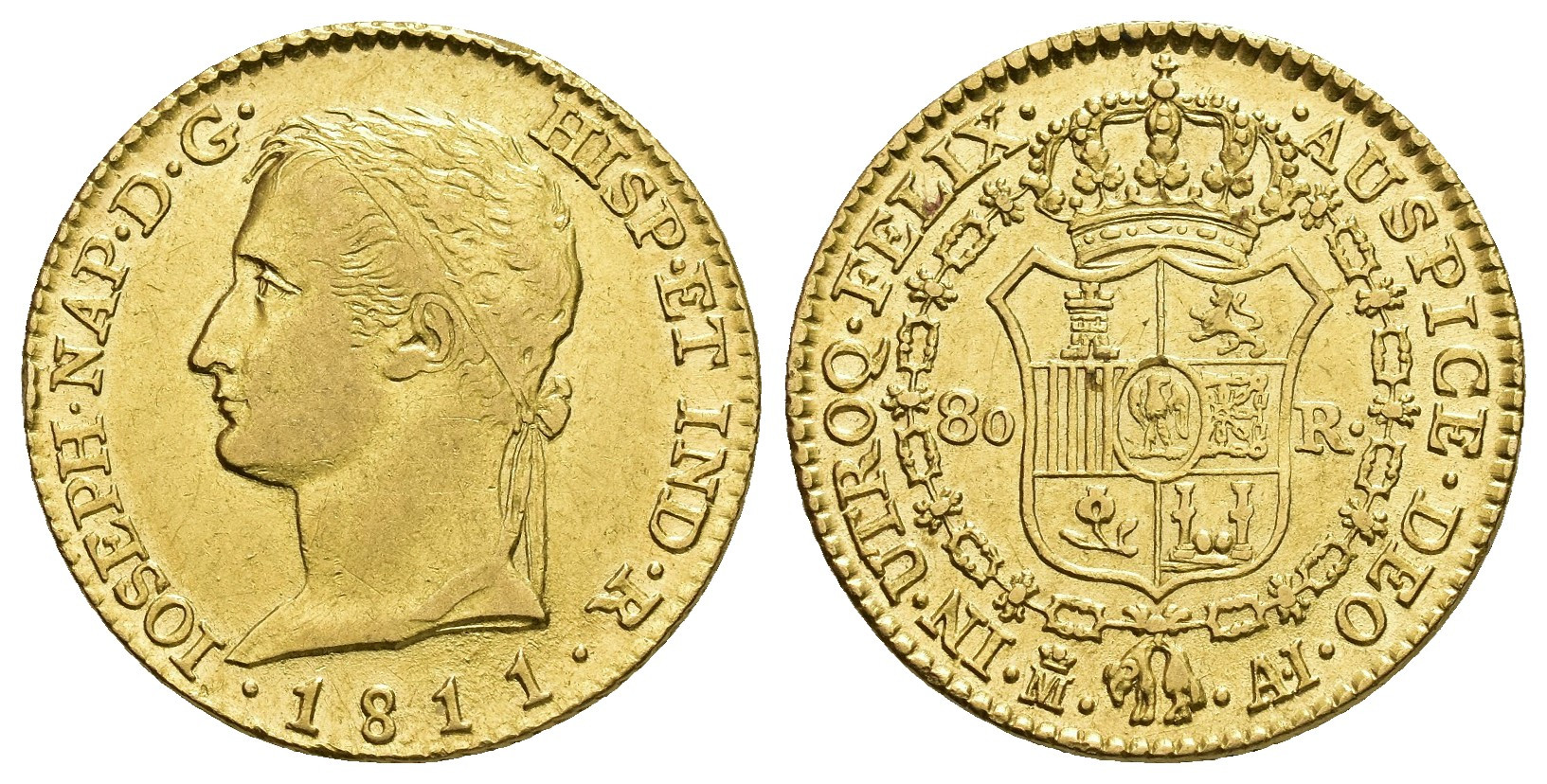 JOSÉ I BONAPARTE. 80 reales. 1811. Madrid. AI. AU 6,82 g. 21,9 mm. VI-40; AC-49. MBC+/EBC-.