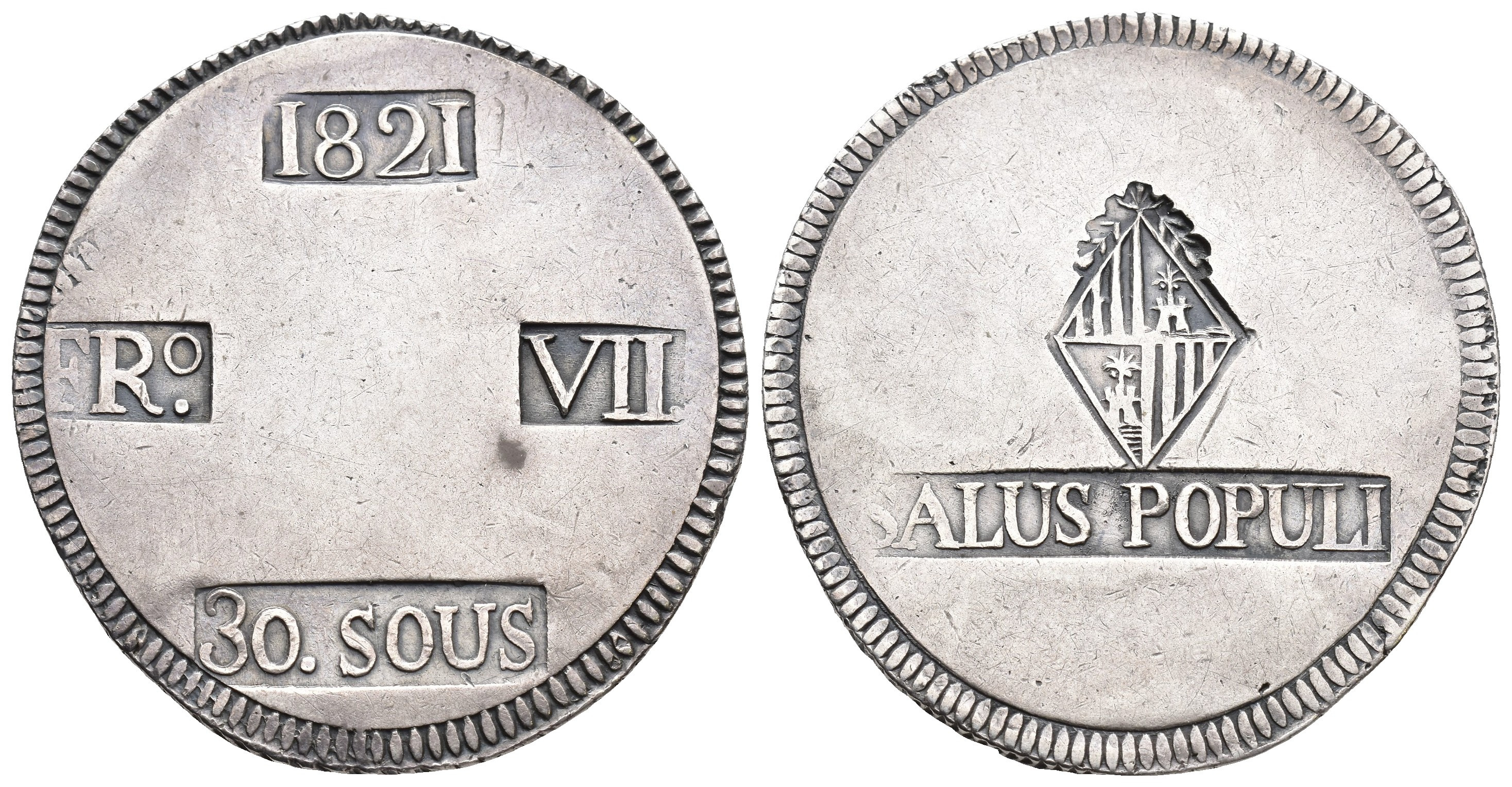 FERNANDO VII. 30 sous. 1821. Mallorca. AR 26,6 g. 41,4 mm. VI-1110; AC-1293. MBC+.