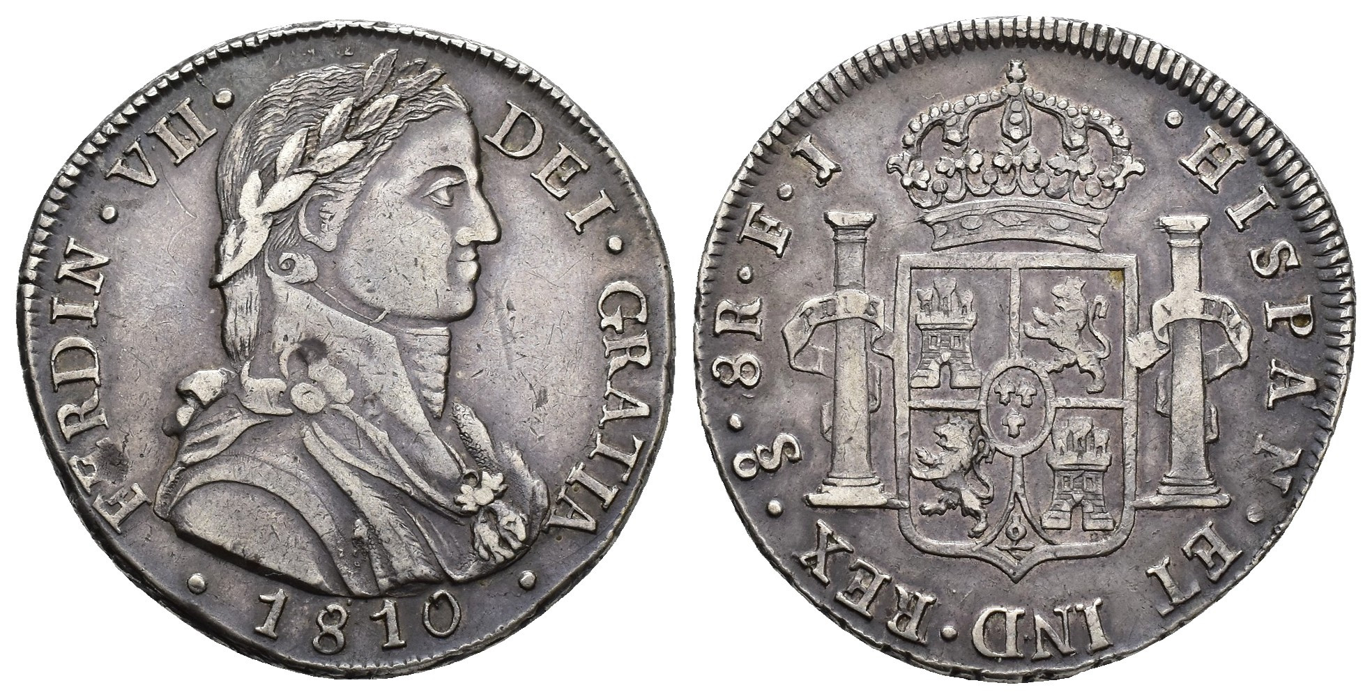 FERNANDO VII. 8 reales. 1810. Santiago. FJ. AR 26,25 g. 40,2 mm. VI-1153; AC-1403. Raya y marcas en anv. MBC+/MBC. Escasa.