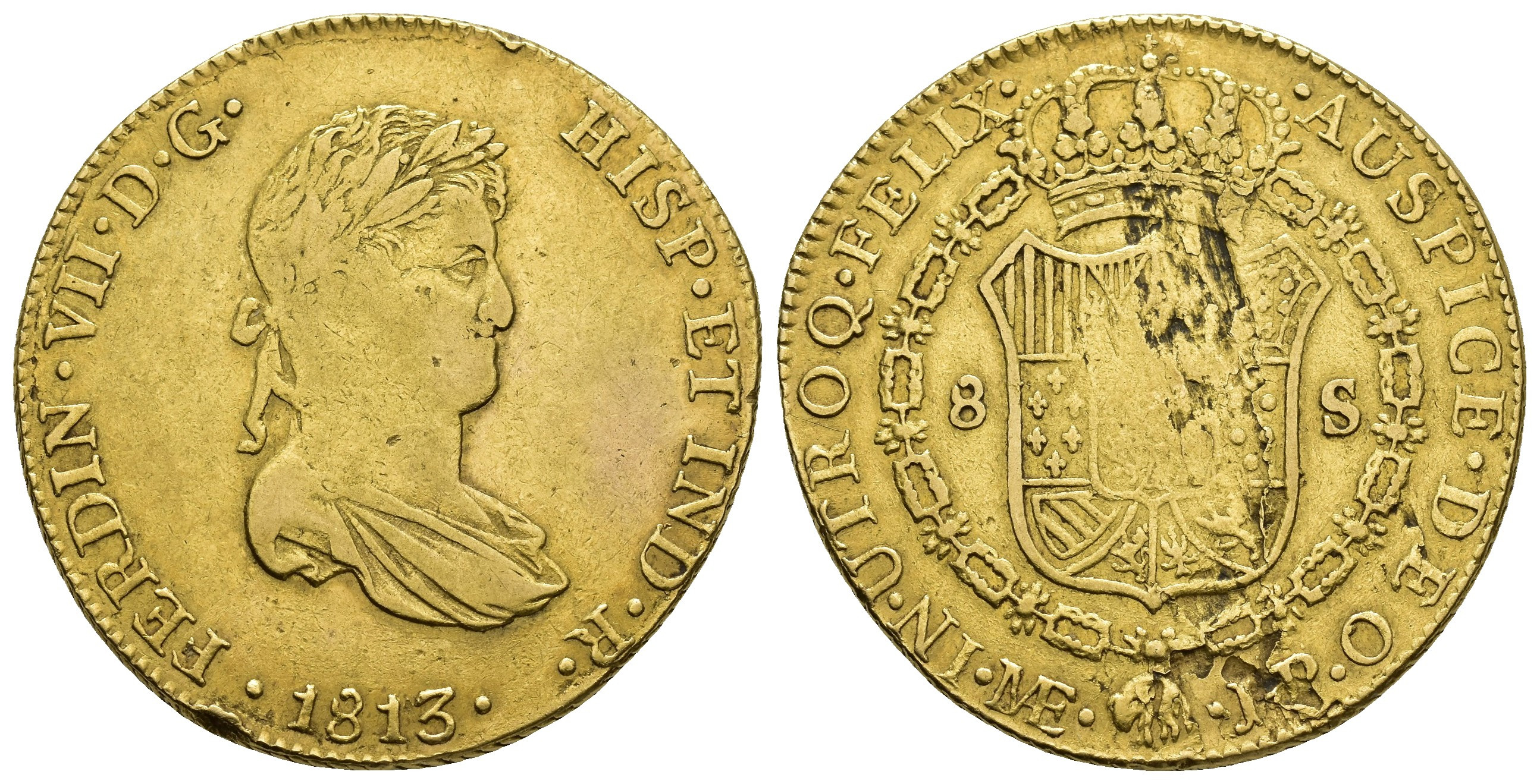 FERNANDO VII. 8 escudos. 1813. Lima. JP. AU 26,98 g. 35,8 mm. VI-1465; AC-1760. Hojas en rev. Golpe en canto. MBC-.