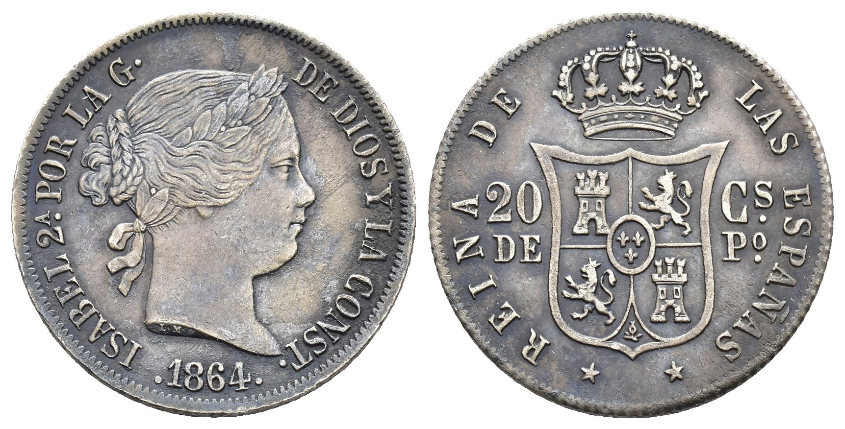 ISABEL II. 20 centavos de peso. 1864. Manila. AR 5,13 g. 23,2 mm. VI-547; AC-657. Pátina oscura. MBC+. Muy escasa.