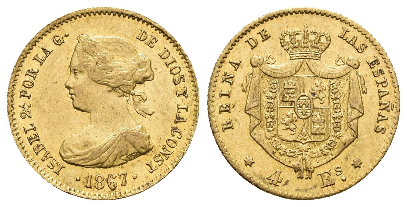 ISABEL II. 4 escudos. 1867. Madrid. AU 3,39 g. 17,9 mm. VI-572; AC-691. Finas rayitas en rev. B.O. EBC+/EBC.