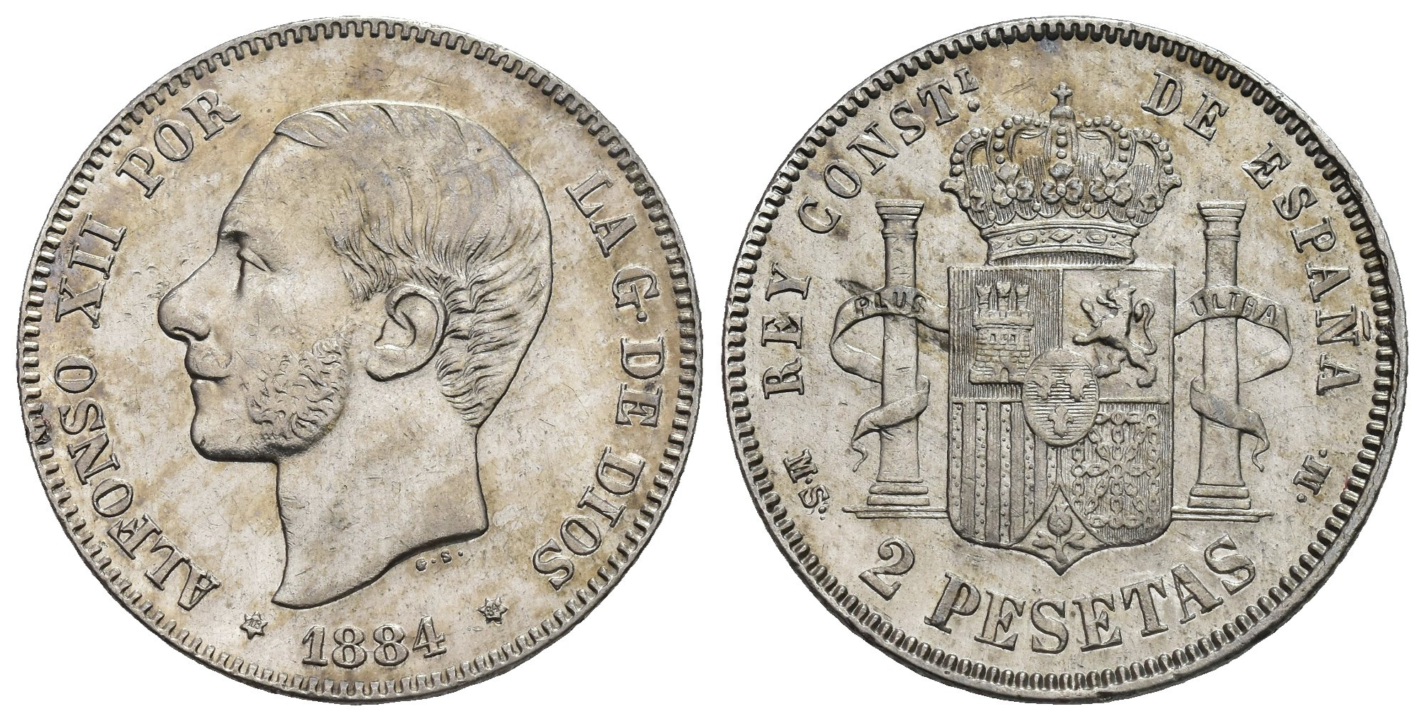 ALFONSO XII. 2 pesetas. 1884*18-84. Madrid. MSM. AR 10,1 g. 27,1 mm. VII-74; AC-34. EBC-.