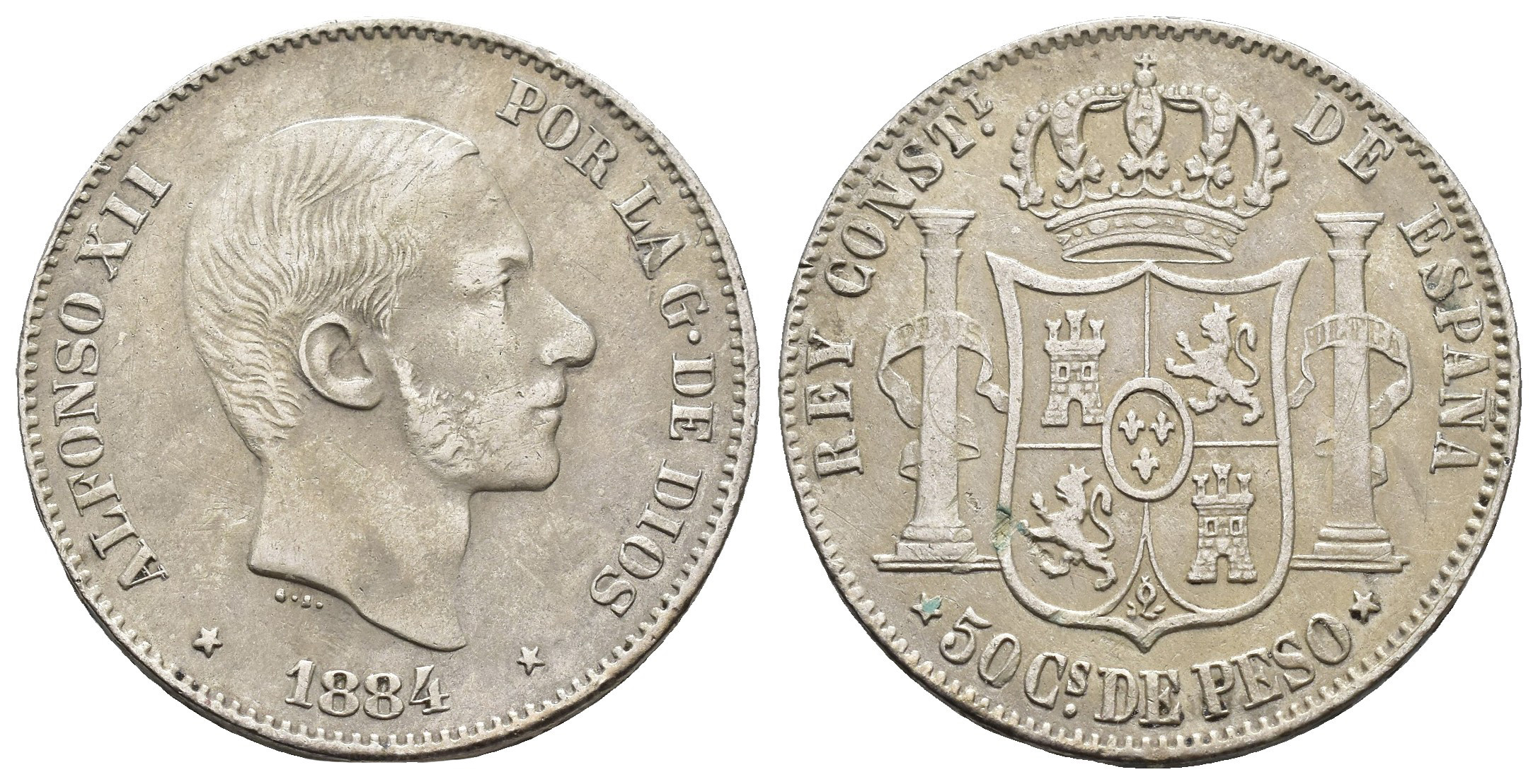 ALFONSO XII. 50 centavos de peso. 1884. Manila. AR 12,31 g. 29,4 mm. VII-79; AC-121. MBC.
