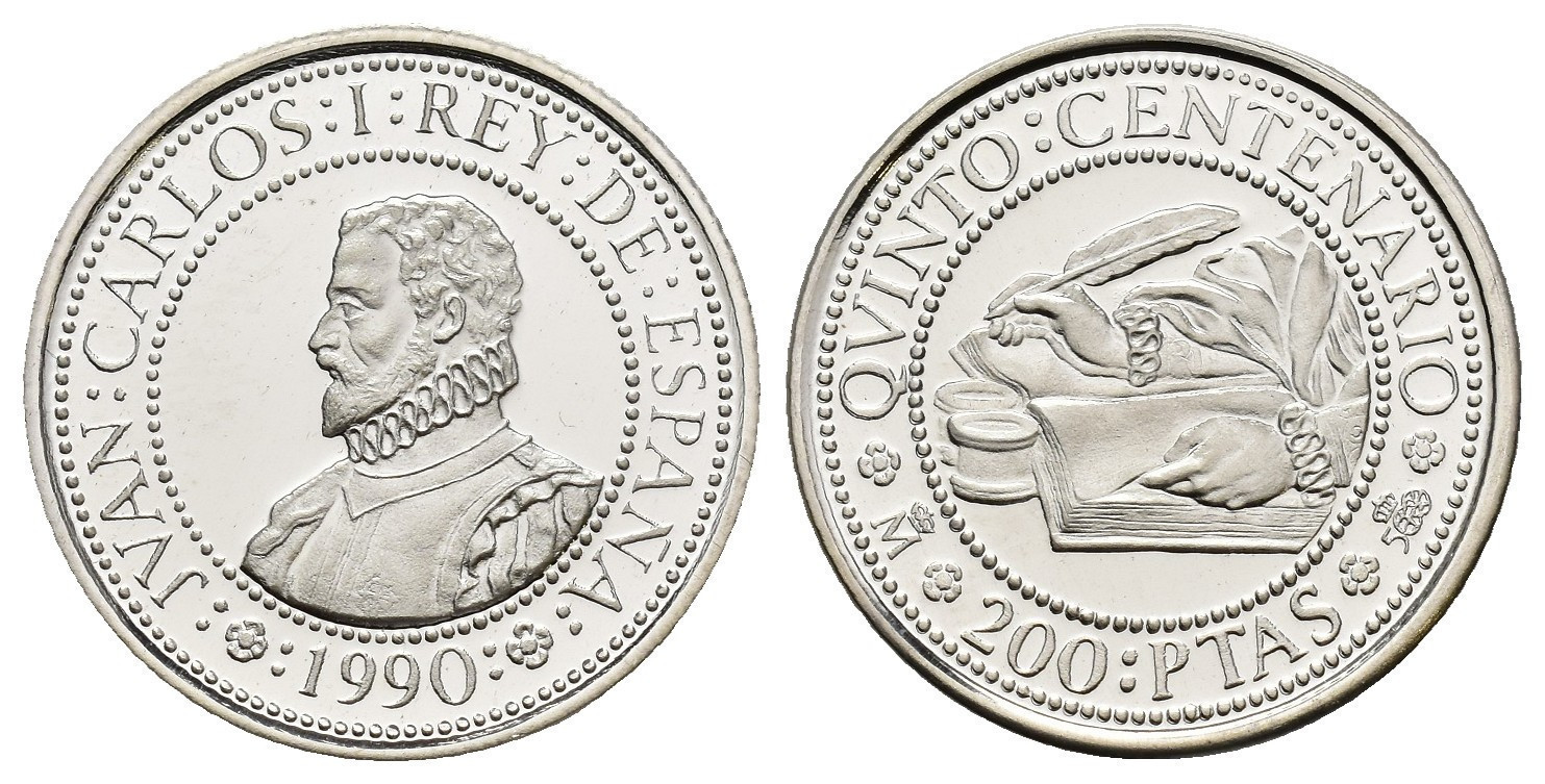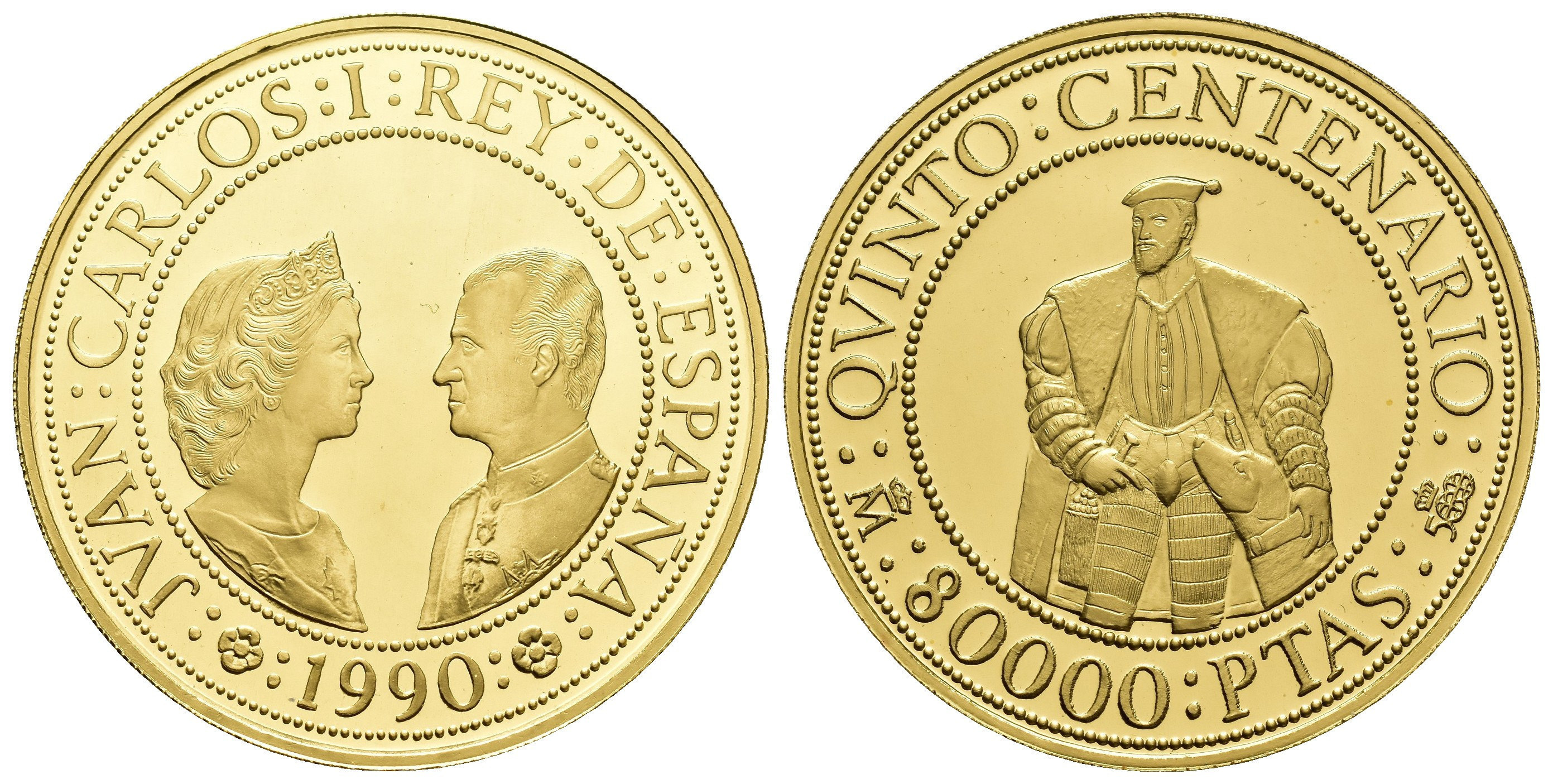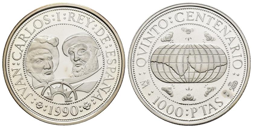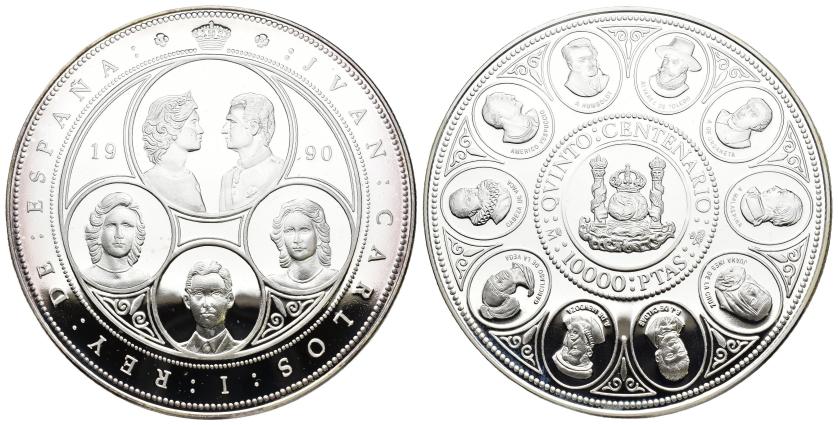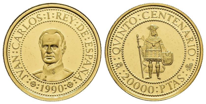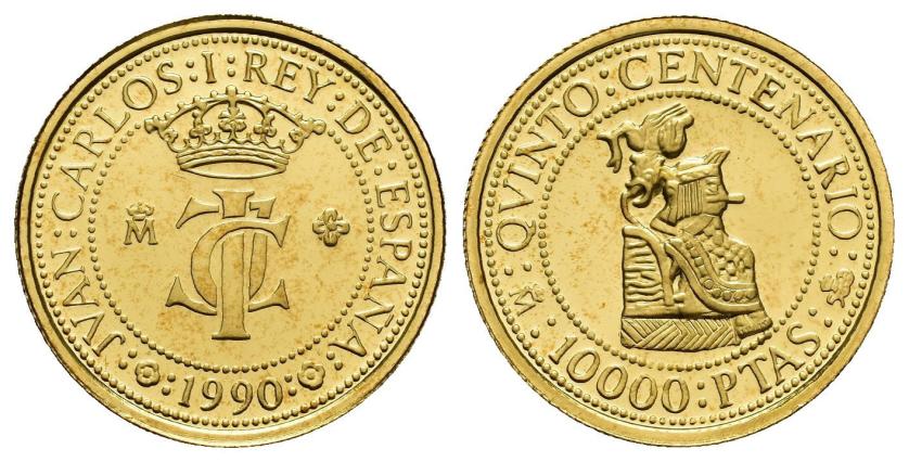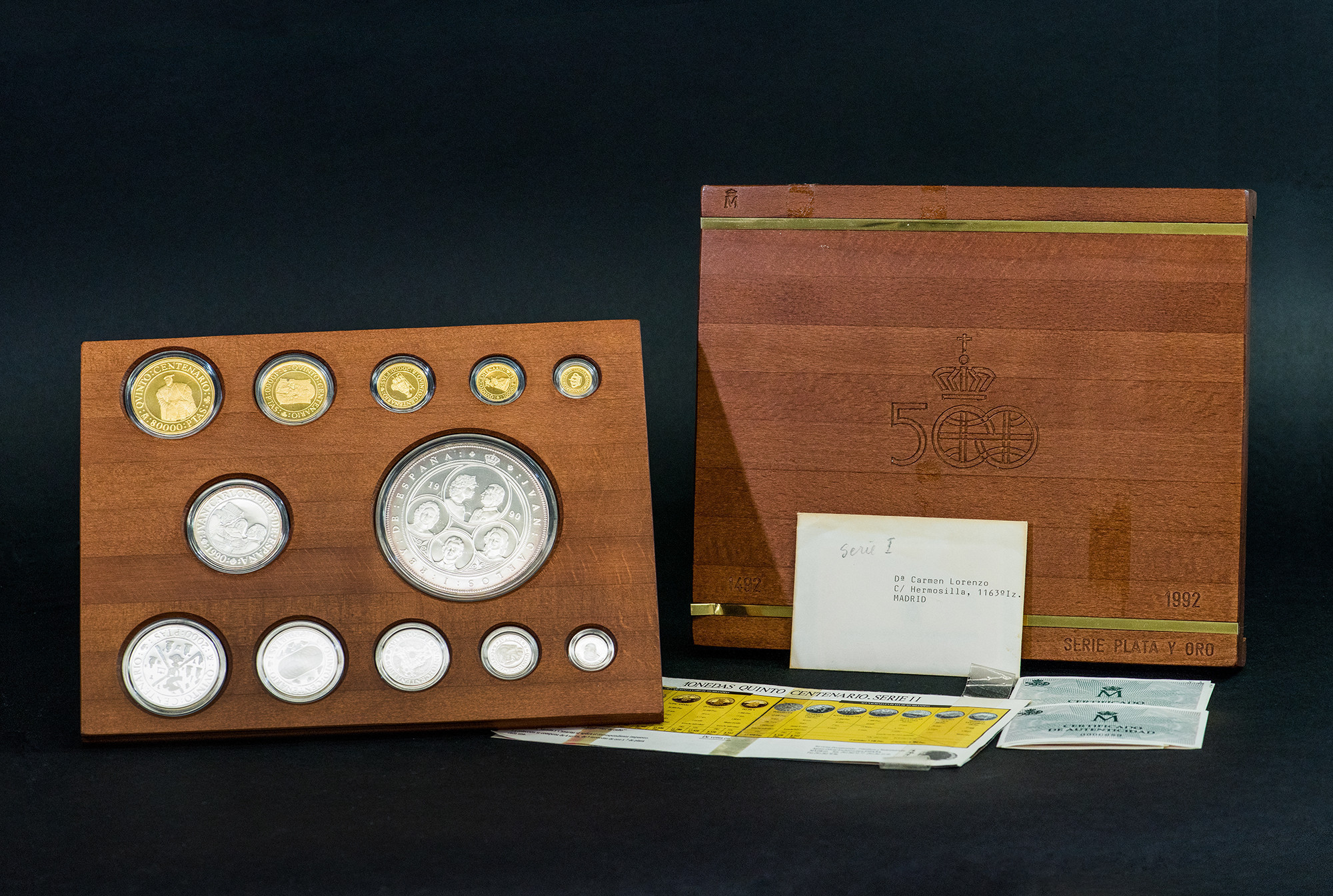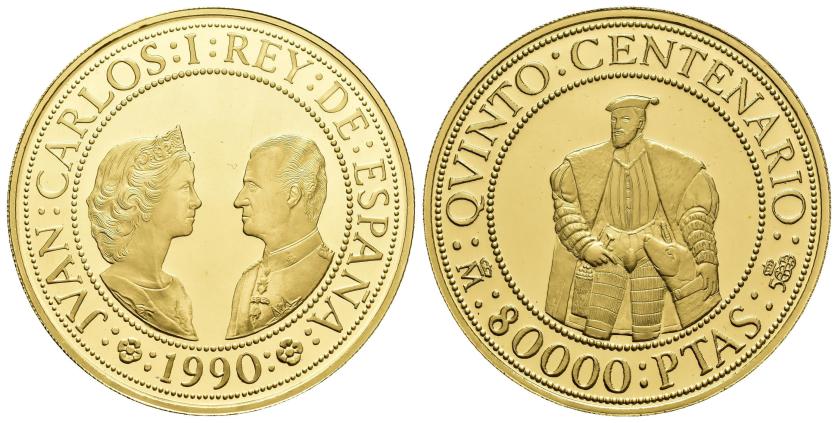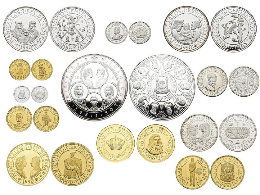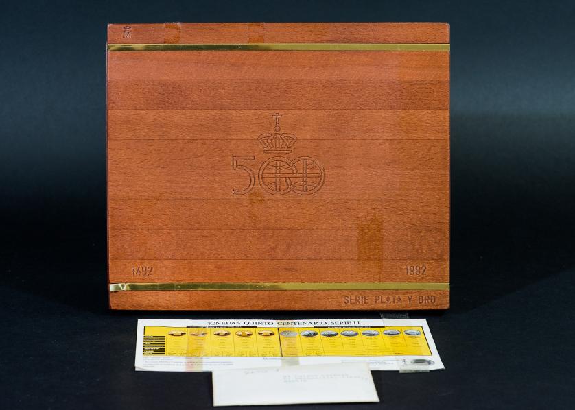 JUAN CARLOS I. Estuche conmemorativo FNMT. V Centenario. Serie II, 5 monedas de oro: 80.000 pts. (AU 27 g); 40.000 pts. (AU 13,5 g), 20.000 pts. (AU 6,75 g), 10.000 pts. (AU 3,37 g) y 5.000 pts. (AU 1,68) g.; 7 monedas de plata: 10.000 pts. (AR 144,75 g), 5.000 pts. (AR 54 g), 2.000 pts. (AR 27 g), 1.000 pts. (AR 13,5 g.), 500 pts. (AR 6,75 g.), 200 pts. (AR 3,37 g) y 100 pts. (AR 1,68 g). Total 12 piezas. En estuche de madera y con certificados. Las piezas de oro y las 5.000 pts. Proof; el resto de piezas de plata, FDC.