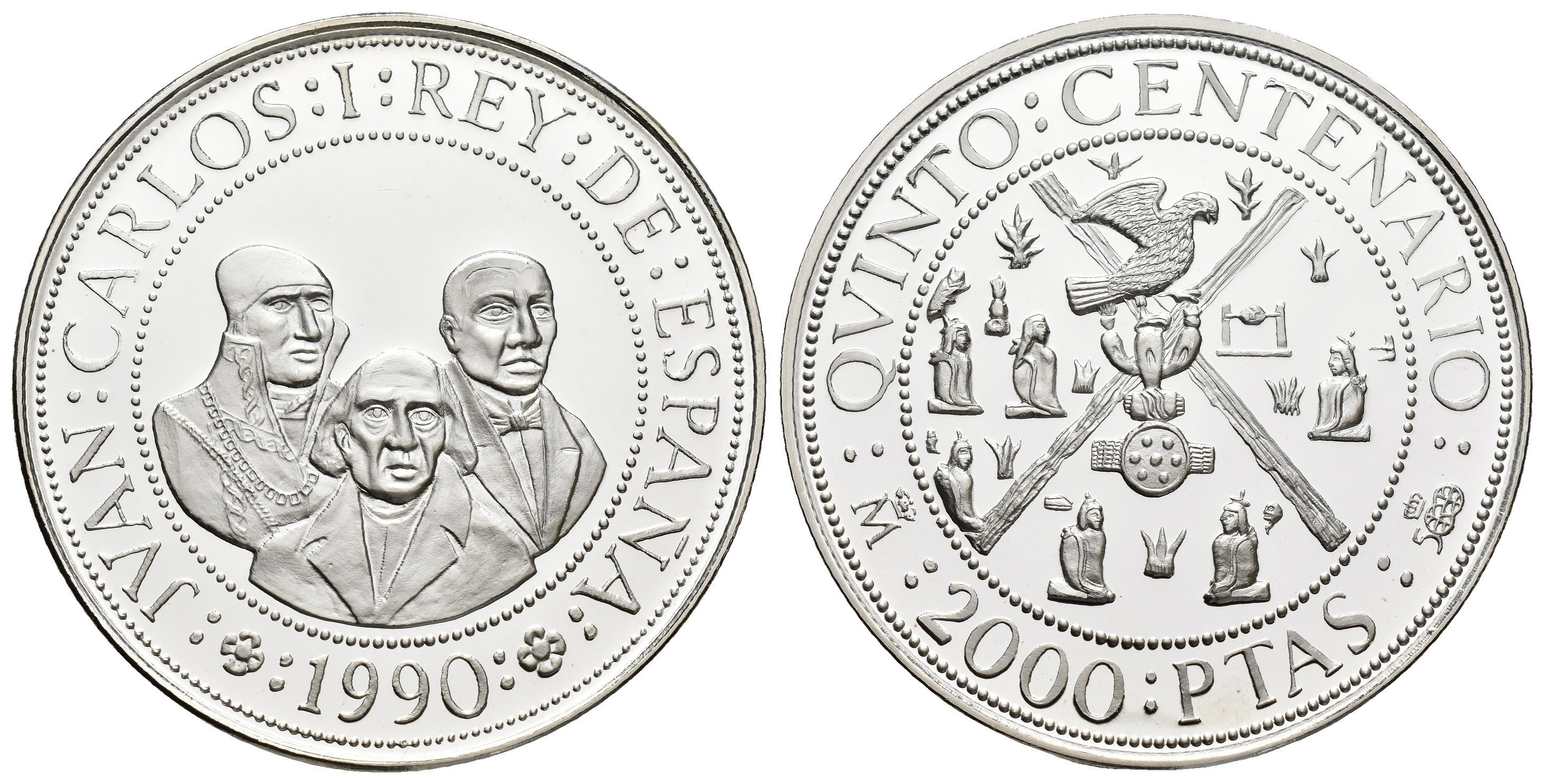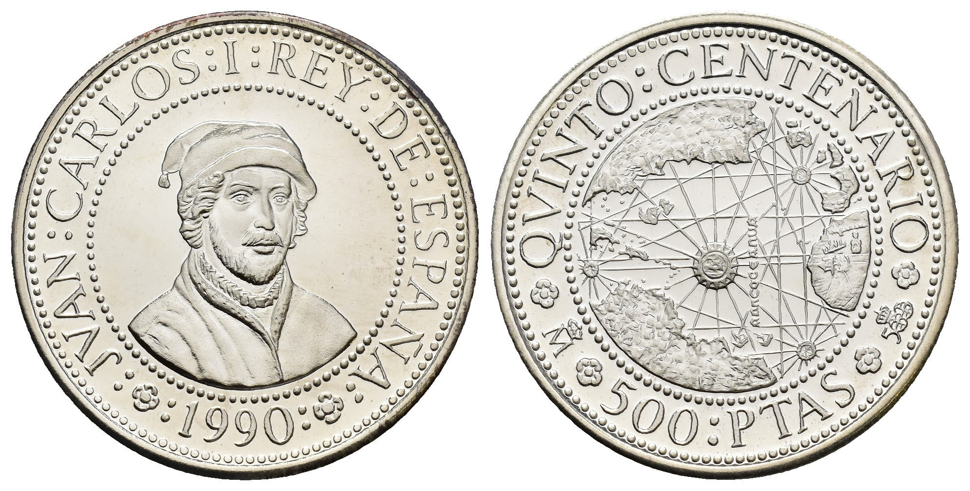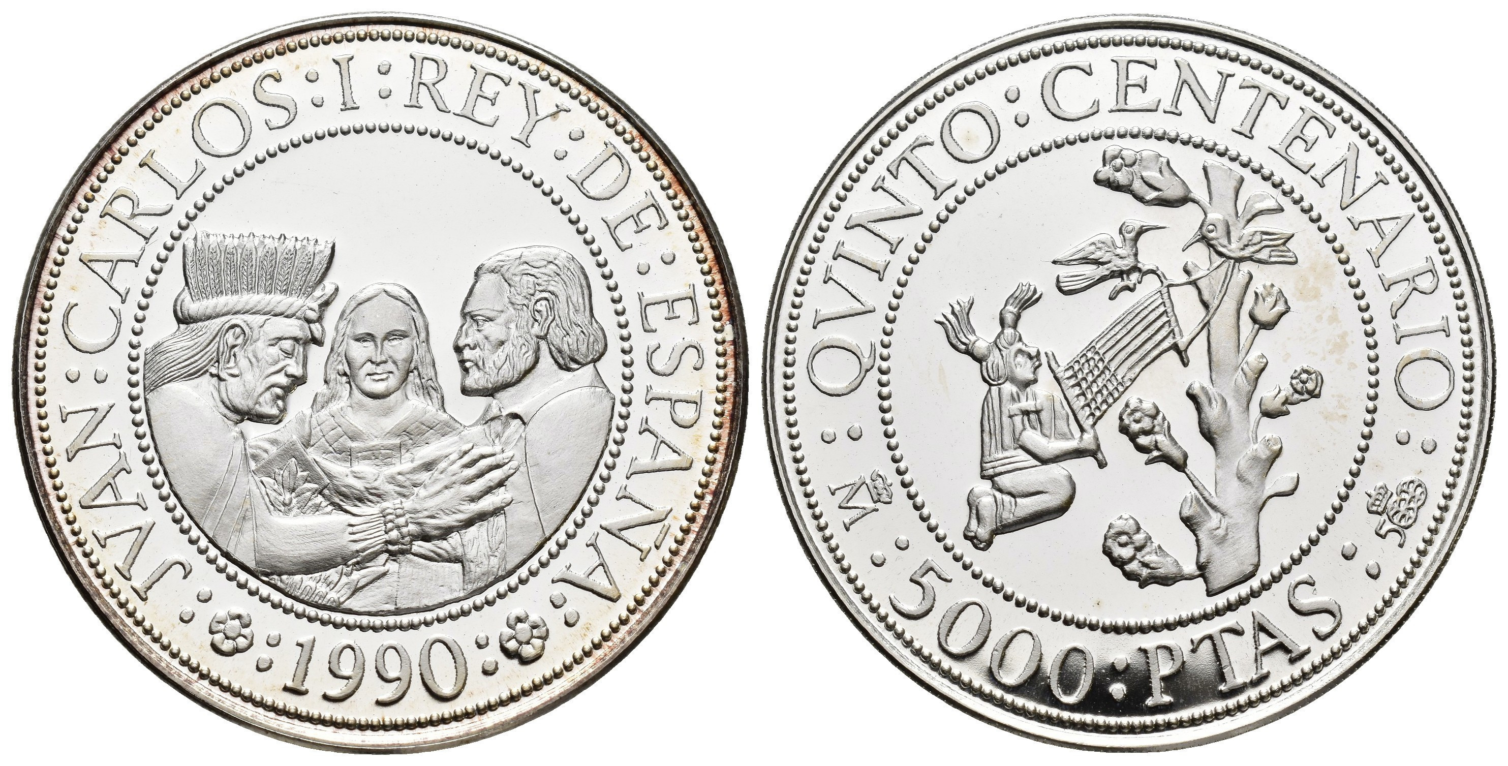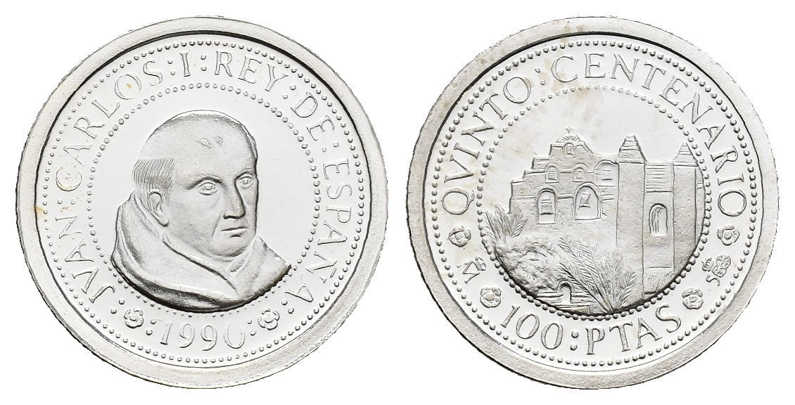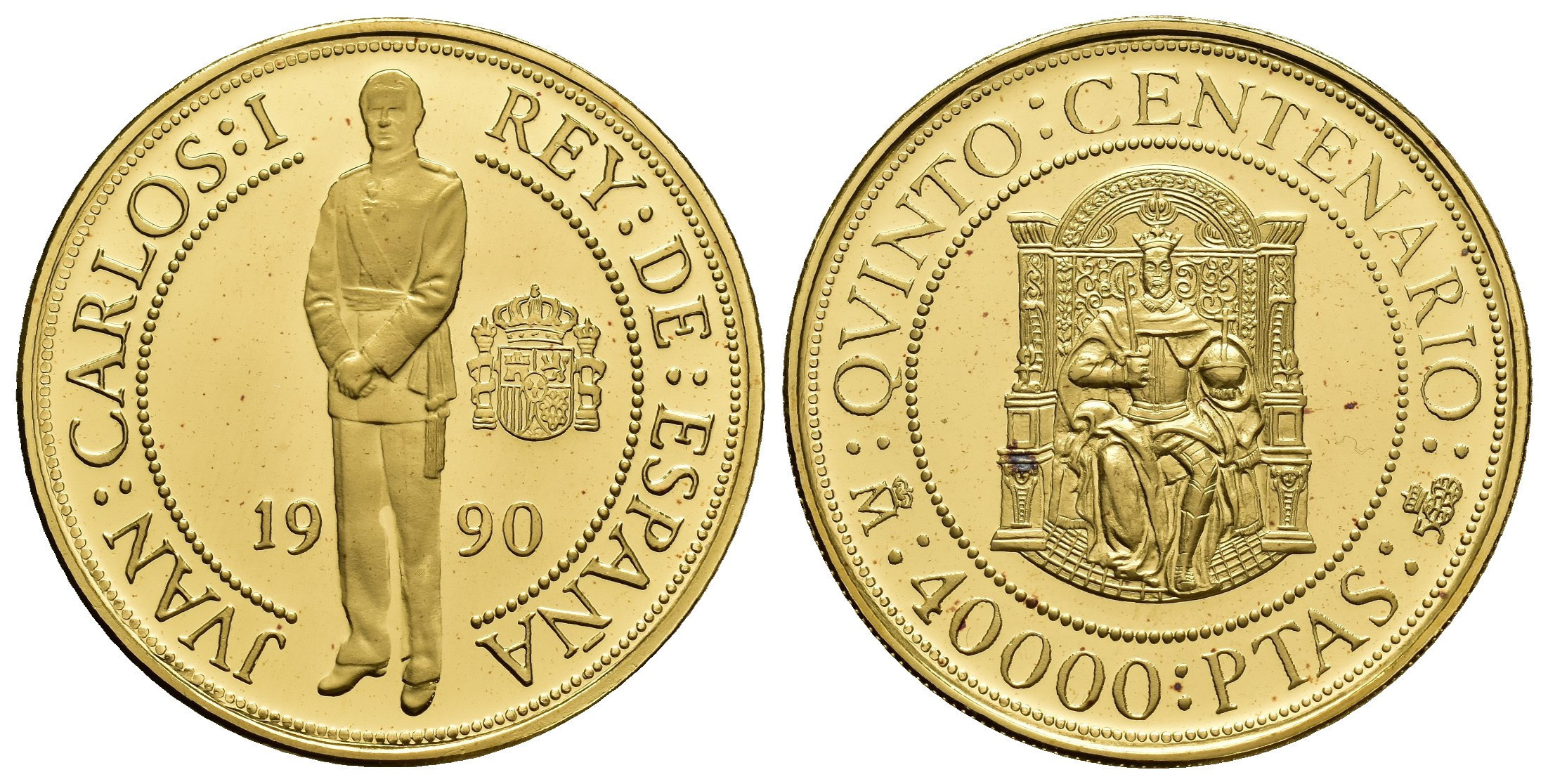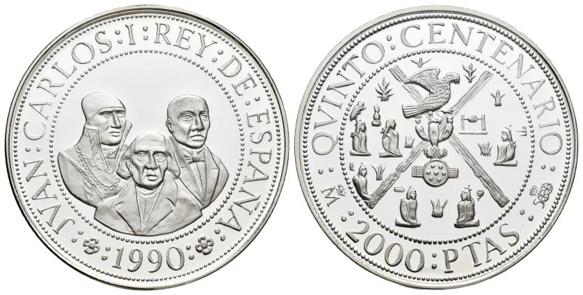 JUAN CARLOS I. Estuche conmemorativo FNMT. V Centenario. Serie II, 5 monedas de oro: 80.000 pts. (AU 27 g); 40.000 pts. (AU 13,5 g), 20.000 pts. (AU 6,75 g), 10.000 pts. (AU 3,37 g) y 5.000 pts. (AU 1,68) g.; 7 monedas de plata: 10.000 pts. (AR 144,75 g), 5.000 pts. (AR 54 g), 2.000 pts. (AR 27 g), 1.000 pts. (AR 13,5 g.), 500 pts. (AR 6,75 g.), 200 pts. (AR 3,37 g) y 100 pts. (AR 1,68 g). Total 12 piezas. En estuche de madera y con certificados. Las piezas de oro y las 5.000 pts. Proof; el resto de piezas de plata, FDC.